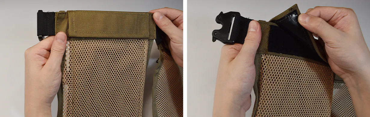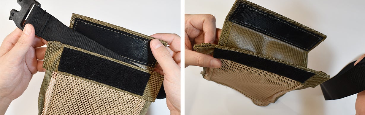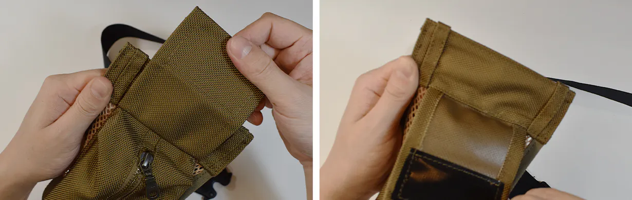 ①ポケット裏面上部のカバーを剥がす(強力マジックテープ)
