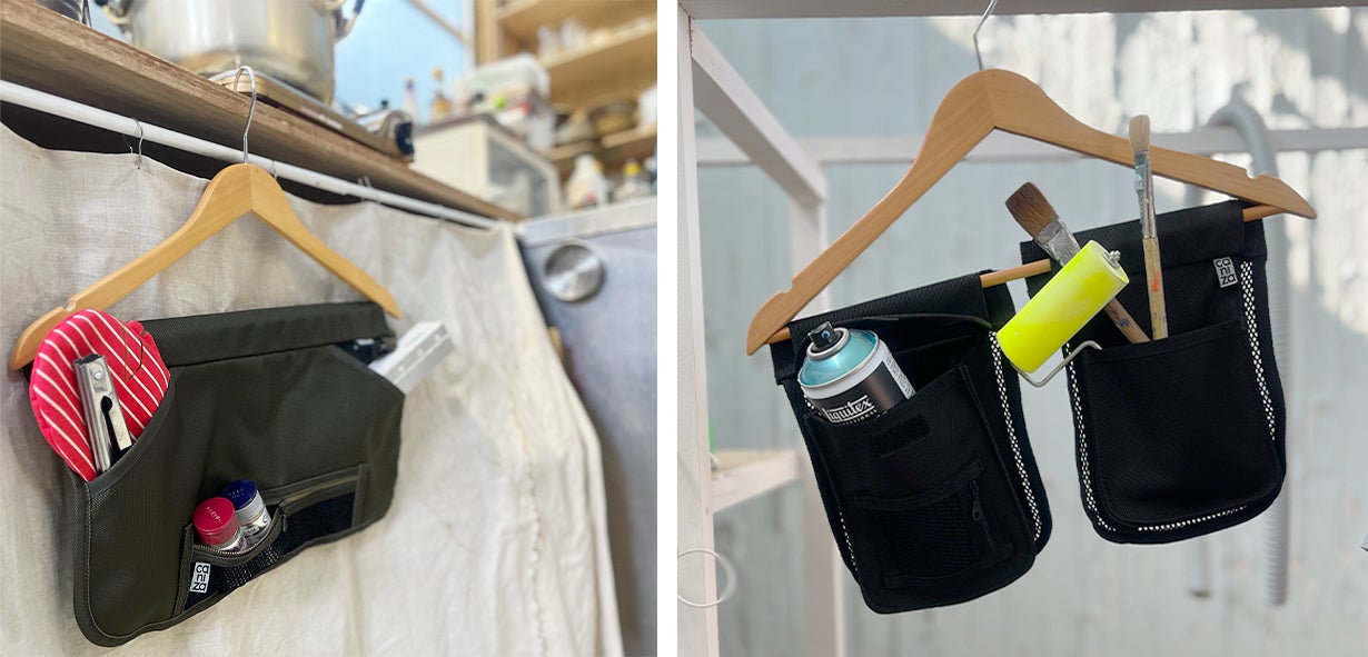 樹の幹やフェンスなどに装着することで即席の荷物入れや工具入れとして使用するのも便利です。