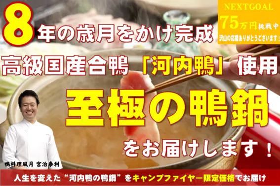 今回、私の人生を変えたともいえるこの河内鴨の魅力を名古屋だけでなく、沢山の方に知っていただきたいという思いから、自慢の鴨鍋をキャンプファイヤー限定価格にてお届けさせていただきます。
