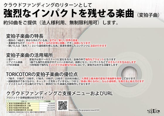2018/04/08 23:07今回のクラウドファンディングのリターンとして、変拍子楽曲を無制限にご利用頂ける法人様向けリターン(個人のご支援も可)を公開しております。 変拍子楽曲は「インパクト」や「違和感」をコンテンツに与える力があります。ので・音ゲー・アイドルの楽曲・TVCM曲などなど、コンテンツの受容者に強い印象を残したい業界で幅広く活用頂けます。 よろしくお願い致します。 もっと見る