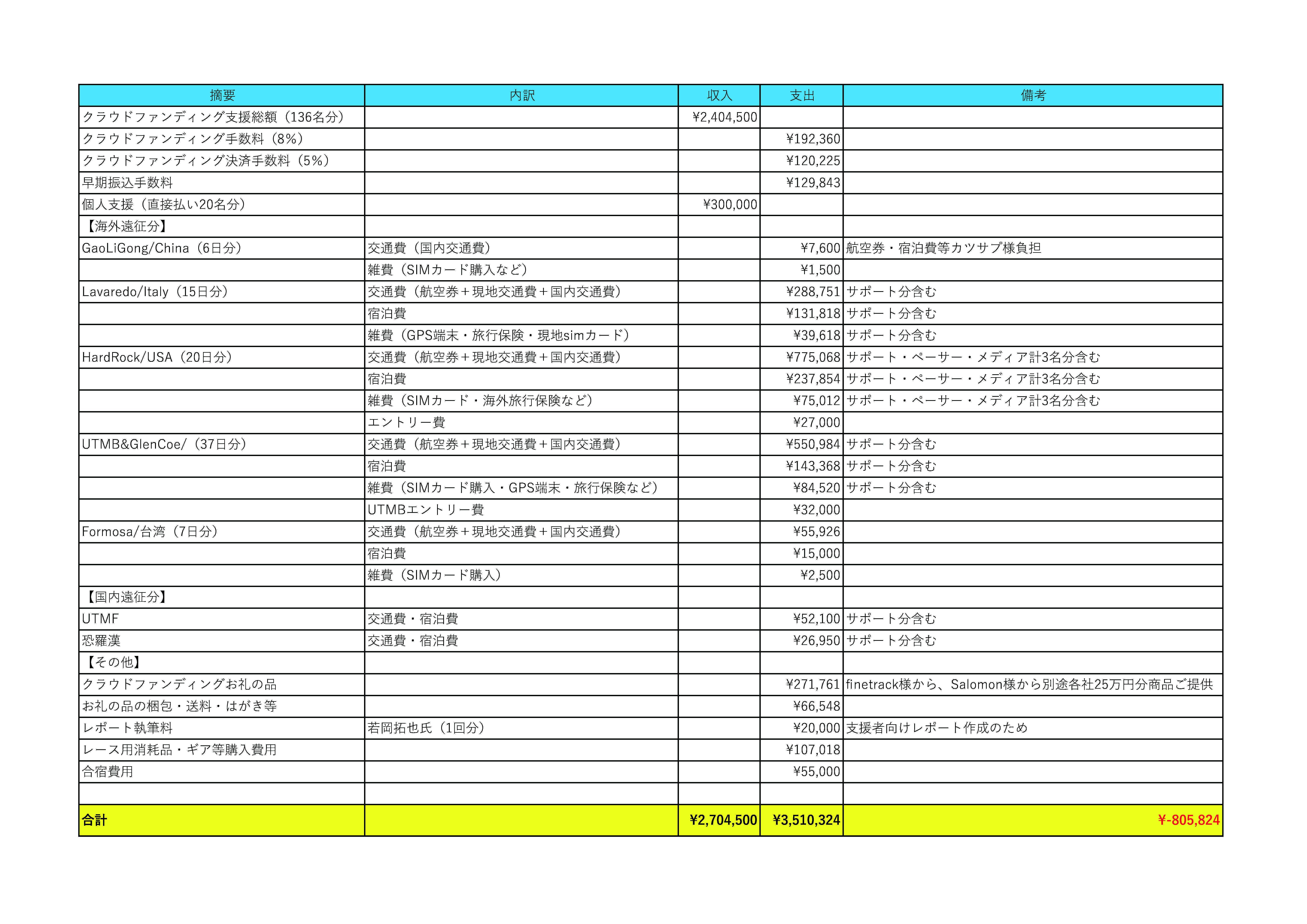 2019/02/01 09:50大変遅くなってしまいましたが、ご支援くださった皆様に収支報告させていただきます。大変多くのご支援を頂くことが出来たため、早めに現地入りしてコースの試走や準備が出来たり、サポートを連れて行って、レース中のサポートをしてもらったりと、昨年の目標達成するために非常にプラスになりました。心からお礼申し上げます。長期滞在になるので、友人の家に泊めてもらったり、なるべく安い宿に宿泊して自炊したりとやりくりしましたが、それでもアメリカのシルバートンでは4WD無しではどこにも行けないため、長期でレンタカーを借りなければいけなかったり、イタリアでの軽油の高さが日本の2倍ぐらいだったりと、思った以上にお金がかかりました。皆様のお力添えがなかったら、絶対に達成できなかった結果です。収支は最終的にマイナスになっておりますが、昨年クラウドファンディングとは別にサポートいただいた各メーカー様のお力添えにより、トントンぐらいで終えることが出来ました。トレイルランニングというマイナースポーツでありながら、日本選手の世界挑戦のためにご支援くださるメーカーや企業の皆様に心から感謝を申し上げます。クラウドファンディング:もりや眼科・神戸マッチ株式会社・あしラボ・針中野フィジカルケア年間契約スポンサー企業:株式会社アリスト(メダリスト)・スタミナ・スポーツ株式会社(カツサプ)・Salomon・finetrack今年は更に大きなエキサイティングな目標に向かってチャレンジして参りたいと思います。現在徐々にFBで今年のレース計画を発表していますが、まだ全てが確定していないため、3月頃には新たなチャレンジの発表と、その資金調達のためのクラウドファンディングを開始させていただく予定です。またレポートなどで皆様とその感動を共有できるよう頑張りますので、皆様のお力添えをいただければ幸いです。 もっと見る