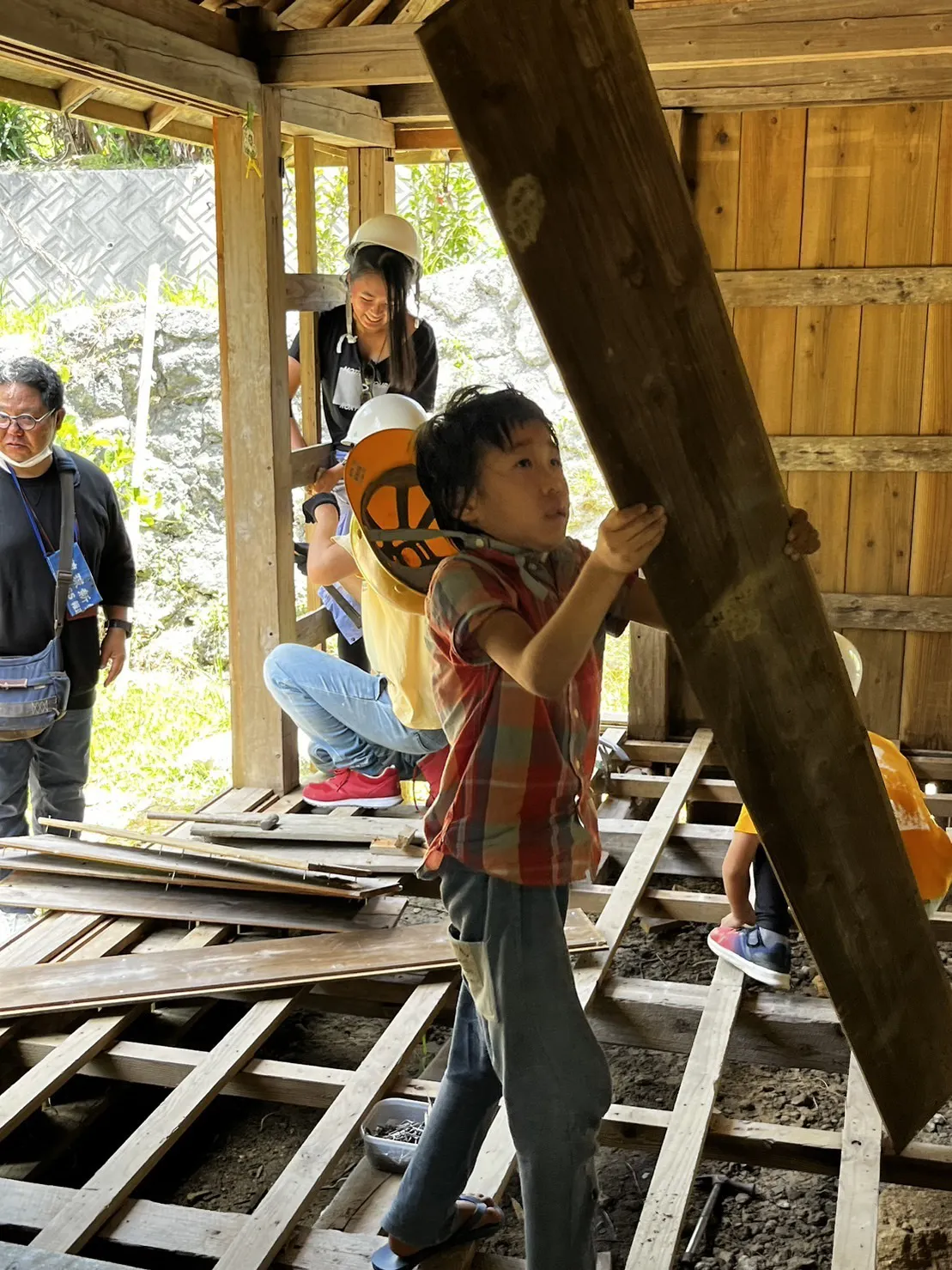 6月9日の山がんまりの日。瓦をおろしおえて、木造の軸を直す作業に入りました。壁を外したり木組みを外したりと、キッズスコーレ(小学校低学年)の子たちも大活躍!卒業生も助っ人に駆けつけてくれました。