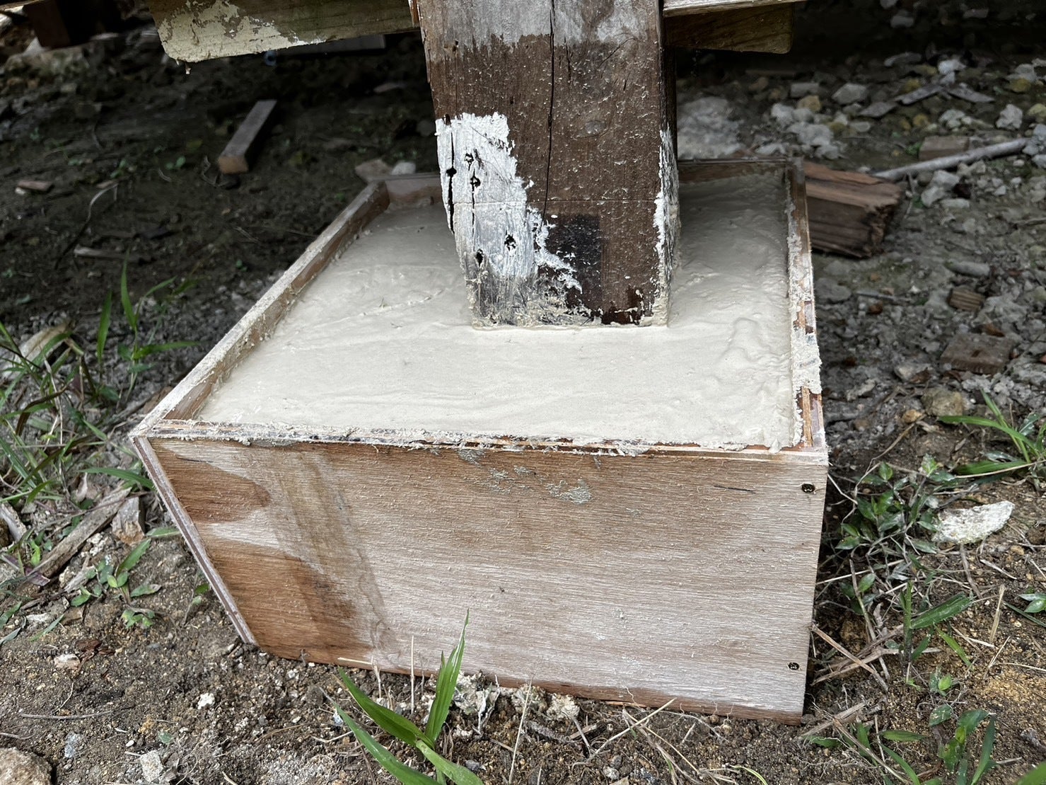 地面がさがって柱の高さがバラバラになっていたので、持ち上げて高さを揃え、基礎をつくりなおしました。流し込むための木枠をつくり、石ぐう(石粉)と漆喰と水を混ぜたものを混ぜて流し込みます。