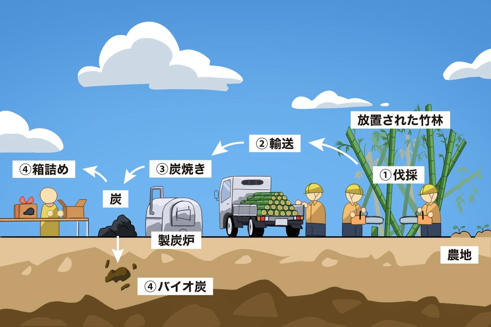 放置竹林の課題や、それらを燃やすことで排出されるCO2、さらに使い終わった炭を畑に戻すという使いみちまで、