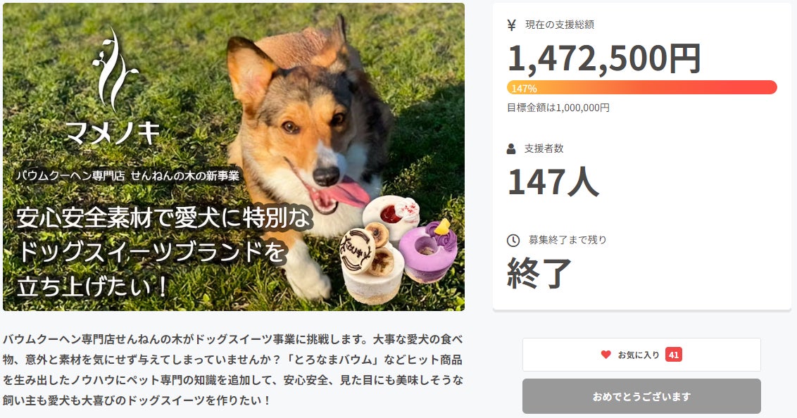 ワンちゃんの飼い主でもある僕。愛犬のコーギー「豆」を育てていく中で、飼い主として食べ物を与える責任の重さを感じていました。(愛犬は、言葉を話せない我が子のような存在ですから。。)そして、スイーツ事業者として、ワンちゃんが安心して食べることができるスイーツを作りたいと考えるようになりました。そんな中で、2021年にドッグスイーツ事業への参入を表明しました。せんねんの木で培ったスイーツの製造技術、企画開発のノウハウで、ワンちゃんも食べられるスイーツを、という思いで実施したクラウドファンディングでは見事に目標を達成!!返礼品として試作開発したドッグスイーツを支援者の皆さんに届けることができました。