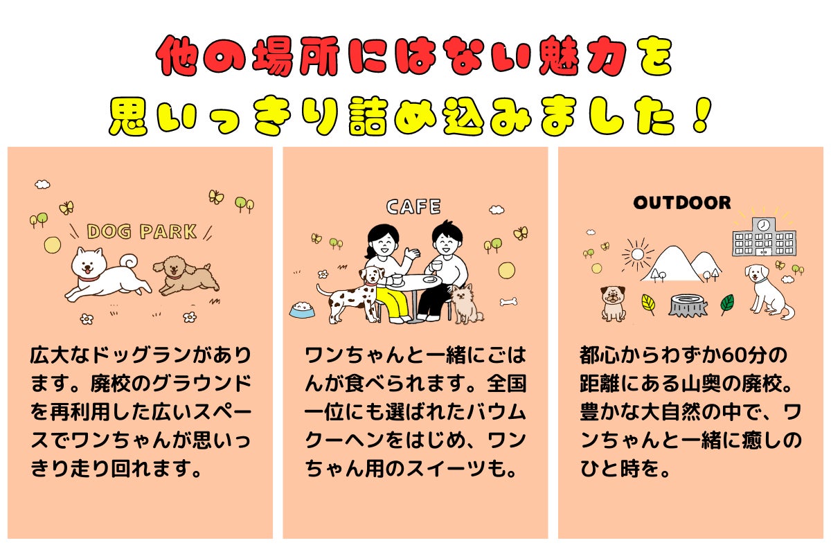 それは、千葉県富津市にある廃校を活用して、ドッグランやドッグカフェ、様々なワンちゃん向けのサービスを詰め込んだドッグパークをつくることです。飼い主さんにとってワンちゃんって「ペット」ではなく「家族の一員」。そんな大切なワンちゃんともっと素敵な時間を過ごしたいって思うはず。校庭を使った広大なドッグランでワンちゃんが思いっきり走り回れる。ワンちゃんと飼い主さんが一緒に極上のスイーツタイムを楽しめる。そんな瞬間を皆さんにお届けできたら、「こんなに幸せなことはないな!」ととてもつよく感じてます。