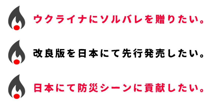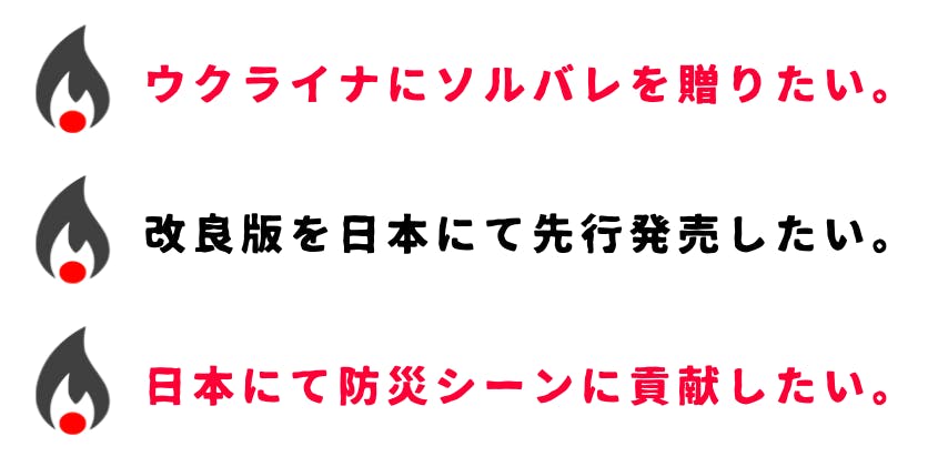 プロダクトの製作やお届けはもちろん、新たなに加わったウクライナ支援(ソルバレを贈る)と防災シーンへの貢献に使わせていただきます。また、ソルティ・バレルの日本上陸にあたってのプロモーションや、その他に付随する活動の一部にも充てさせていただきます。そして、意外とCAMPFIREの手数料もバカにはならない事を知りました。そちらにも充てさせていただきます。