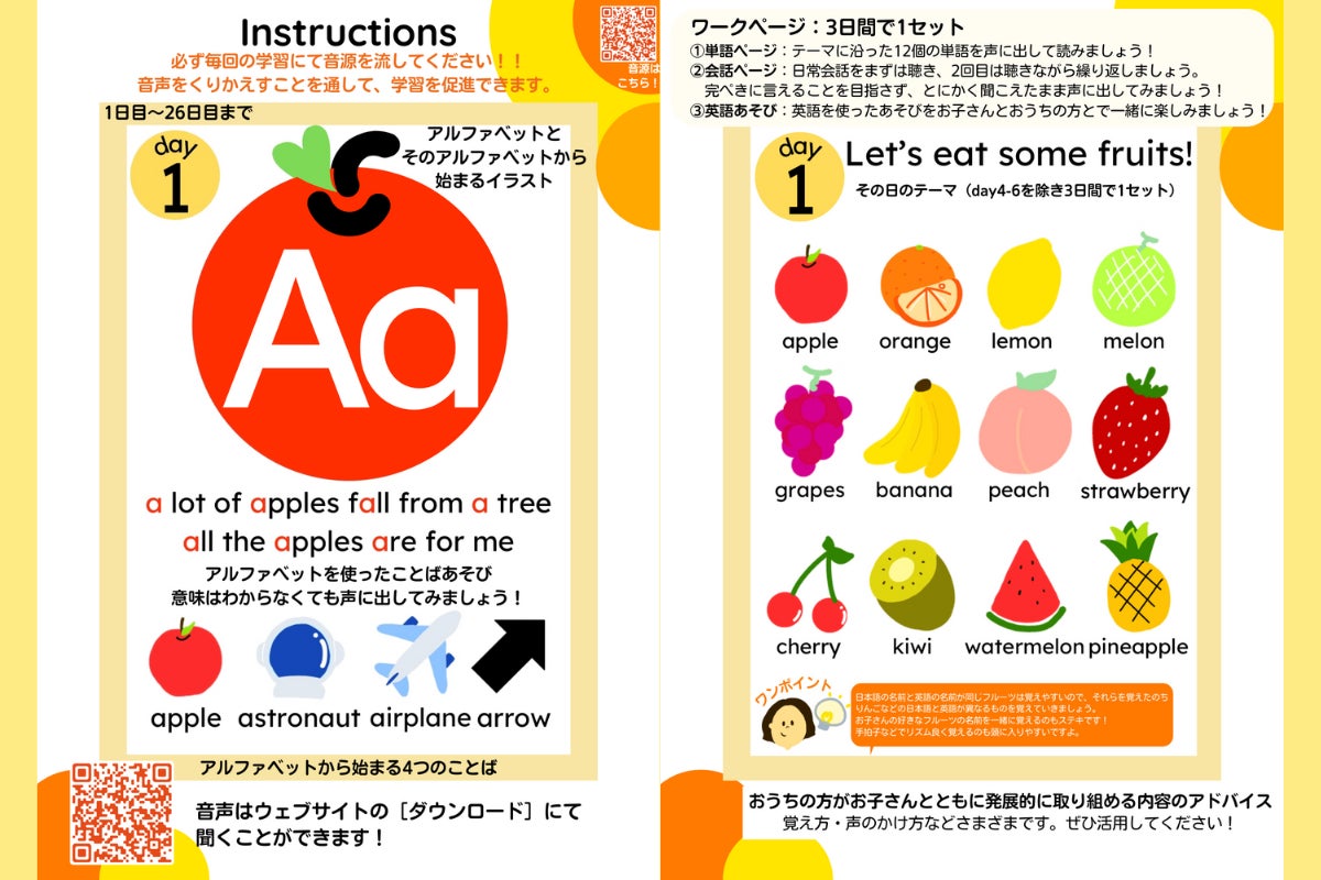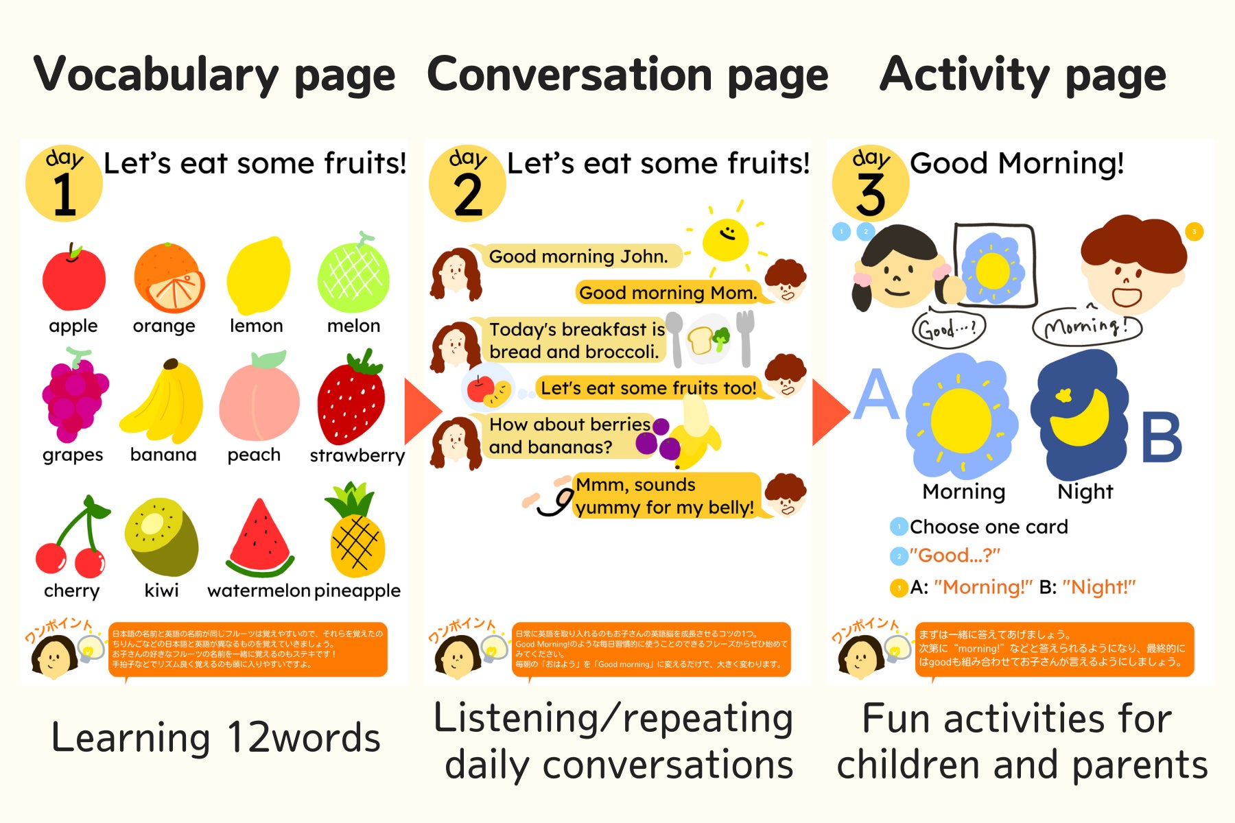 This project aims to publish an originally made English workbook “One, Two, Three, English!” for children and their parents/guardians to enjoy English and communicate together.