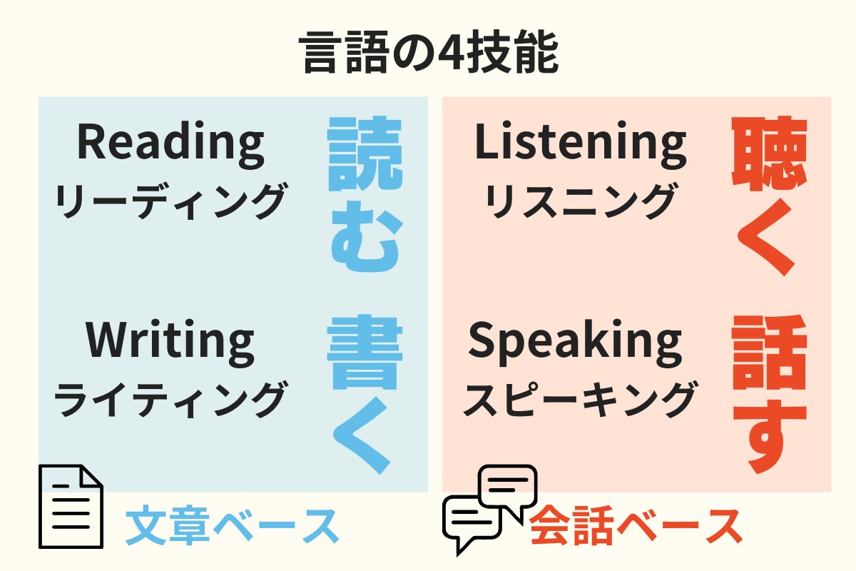 言語には主に4技能あり、その中で、主に会話で用いられる技能がリスニングとスピーキング能力です。
