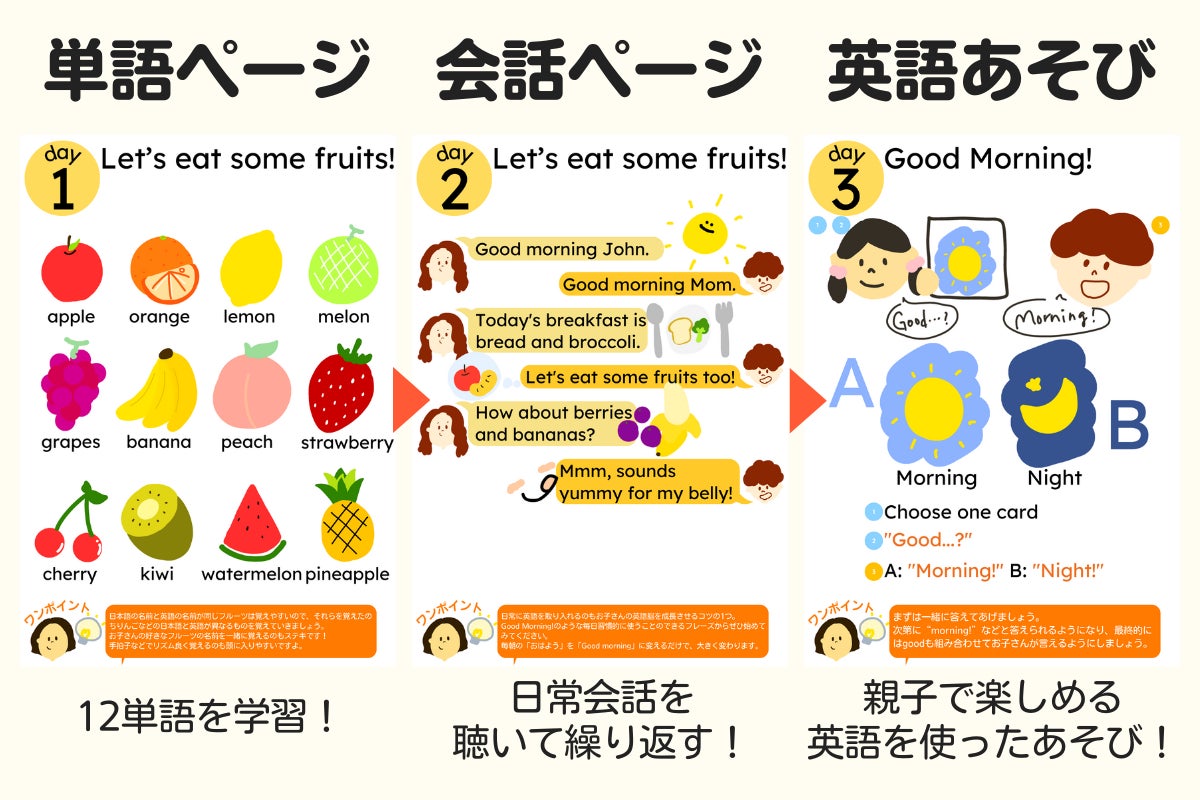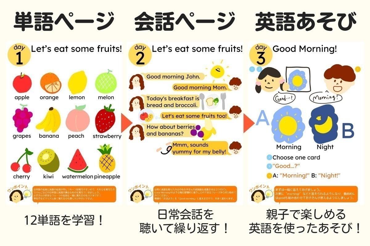 ポイント③:基礎単語力・会話の音・英語へ親しむきっかけを網羅した3種の学習ページ!