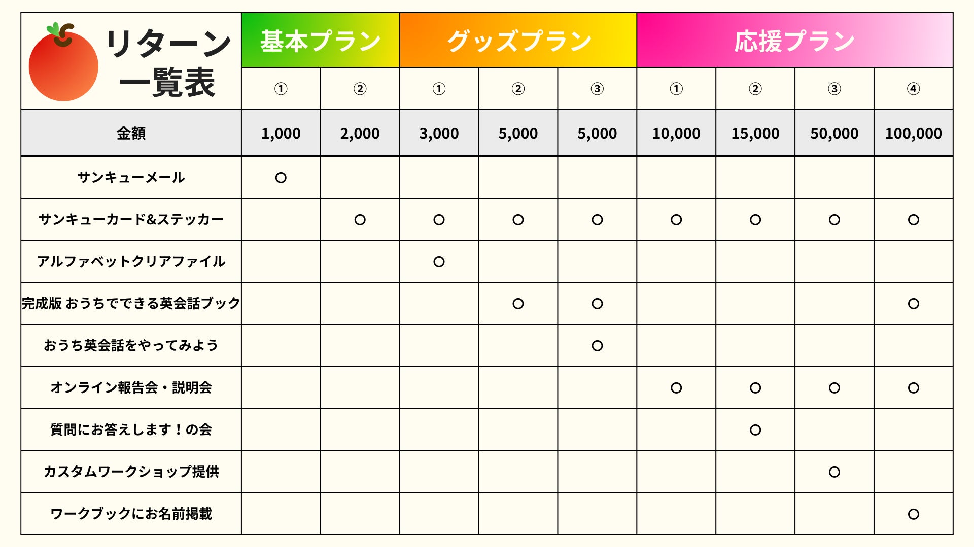 本プロジェクトで目標金額が集まった場合は、日本中の子どもたちとおうちの方々に、英語の楽しさとコミュニケーション能力を育むチャンスを届けることができます。