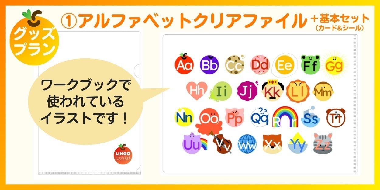 サンキューカード・オリジナルステッカーに加えて、ワークブックで使われているアルファベットのイラストを並べた、ここでしか手に入れることのできないクリアファイルをゲットできます!