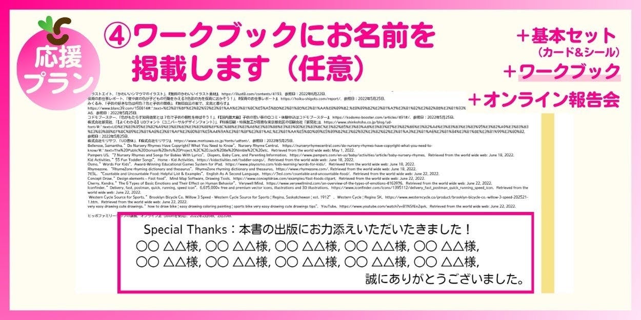 このリターンを選んでいただいた方のお名前を、ワークブックにSpecial Thanksとして掲載させていただきます。
