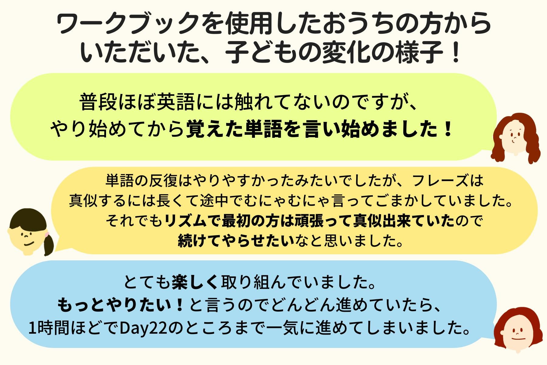 おうちの方からは、「英語を日常的に言い始めた!」「楽しんで取り組んでいた!」などの声をいただきました!