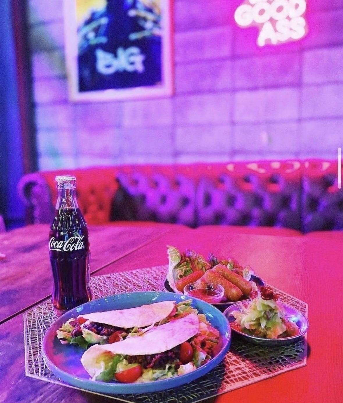 お食事は、タコスや海鮮を使った南米風料理、アメリカンジャンキーフード(自店、ガレージカフェFIVEよりイメージ)