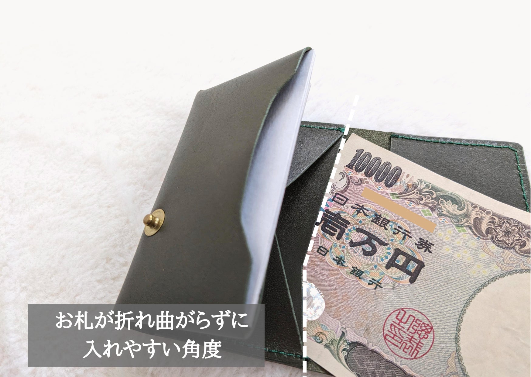 お札が滑らかに動けるように透明のフィルムを革の間に縫い付けてあります。このフィルムの上をお札が滑り、またカードのスペースとの仕切りにもなっていること、財布の開く角度を徹底的に見直したことでスムーズに出し入れすることが可能となりました。