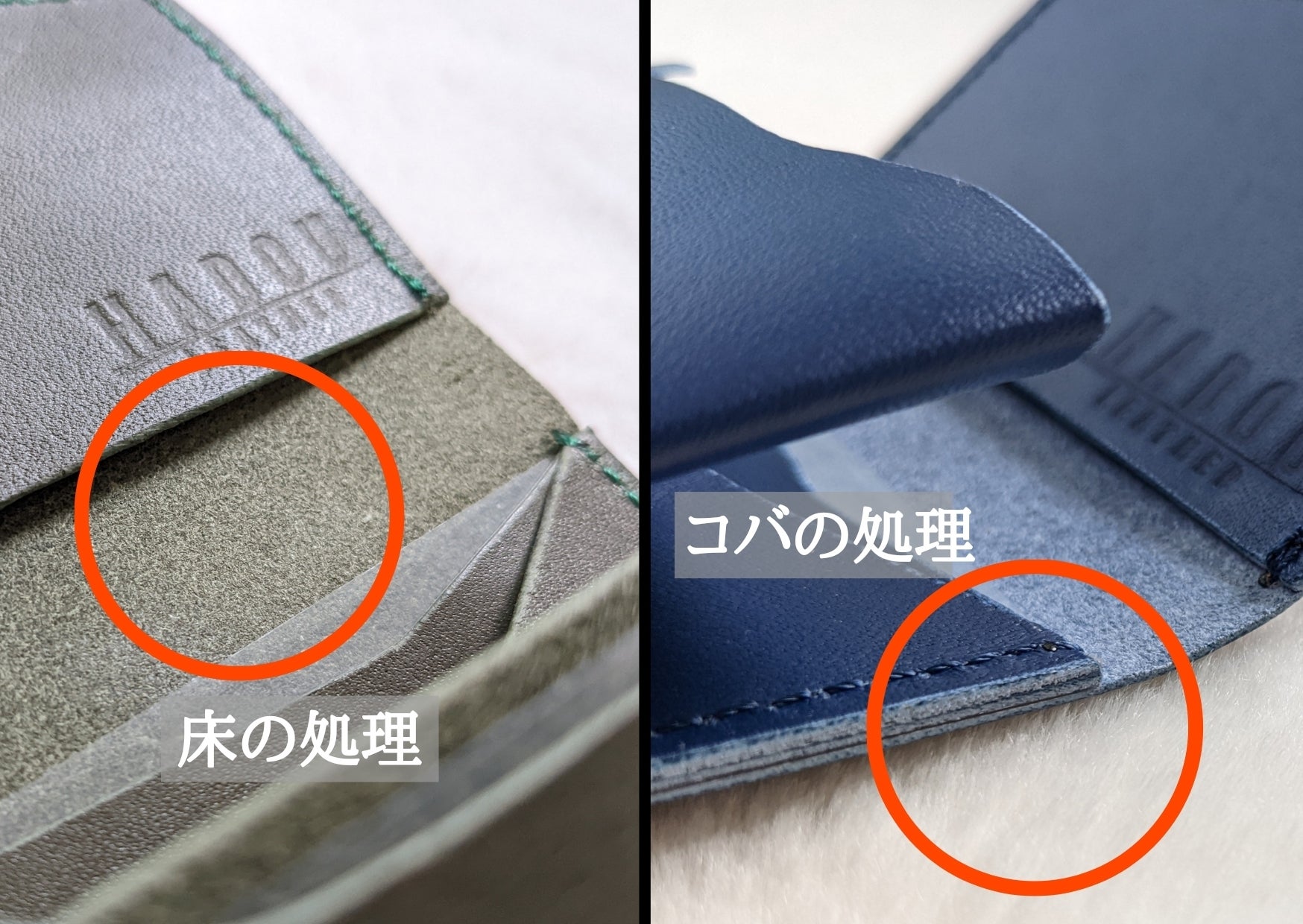 革の床(裏面)やコバ(革の断面)は素材そのままでは毛羽立って見た目が悪いことや、革自体の耐久性も悪くなります。床やコバを整える工程は手間と時間を要するところですが、細かいところまで品質向上に努めております。