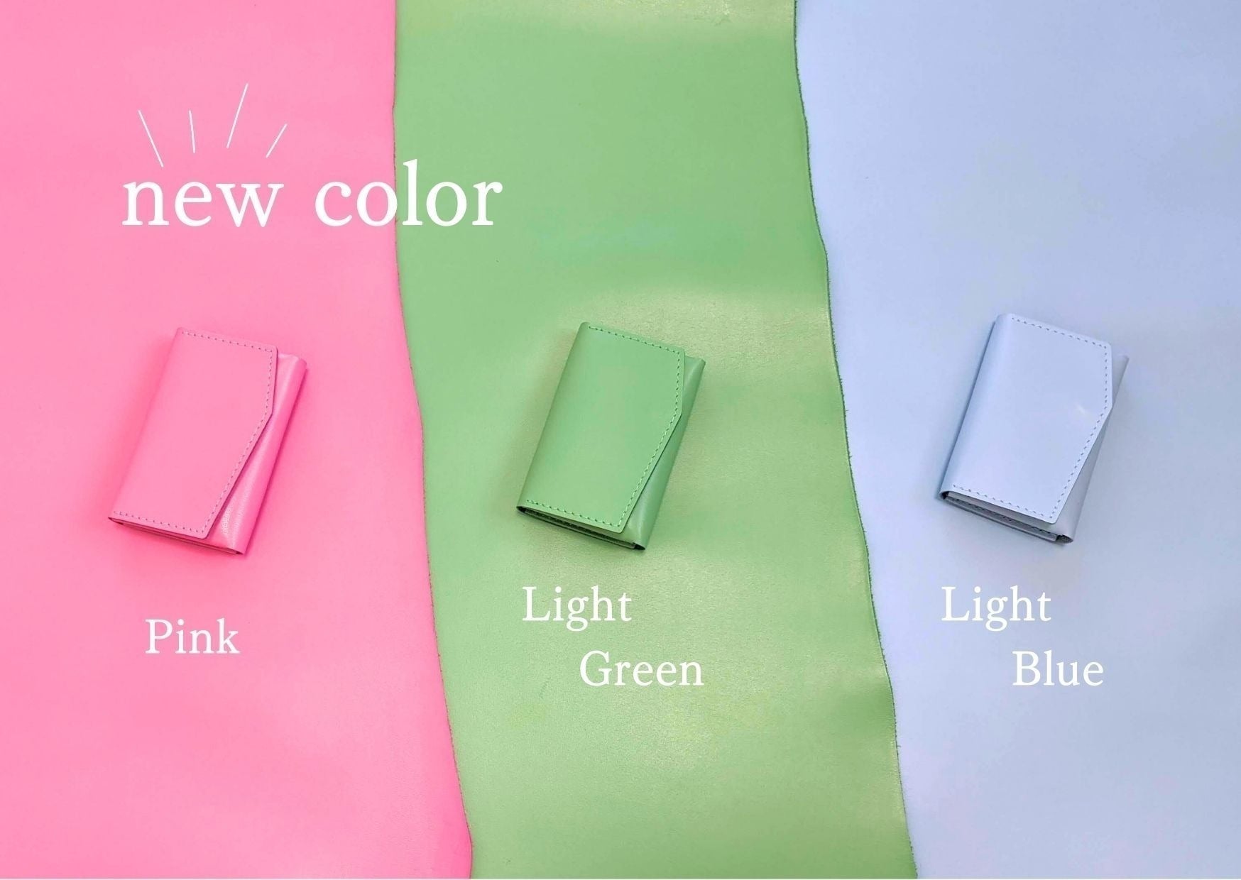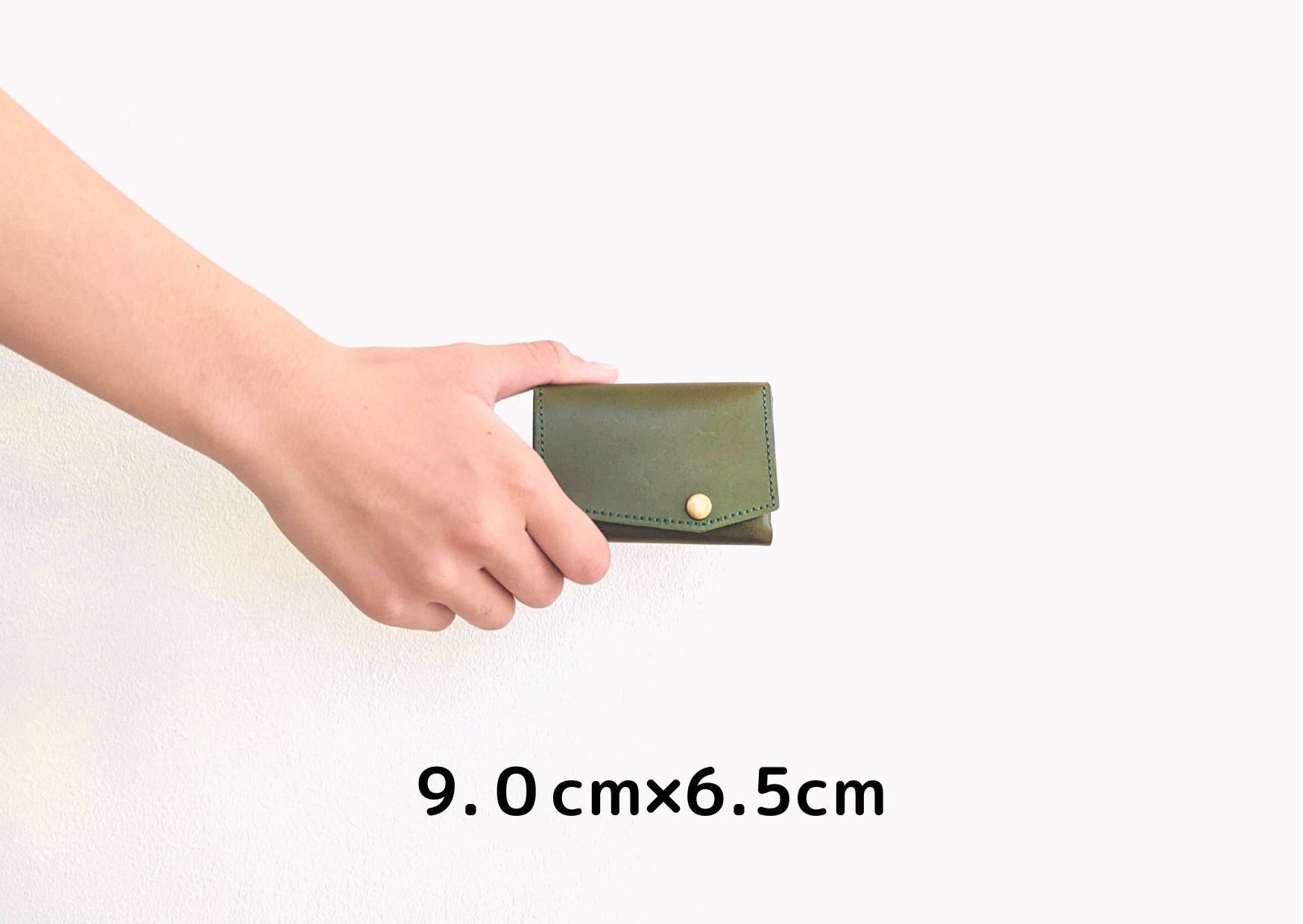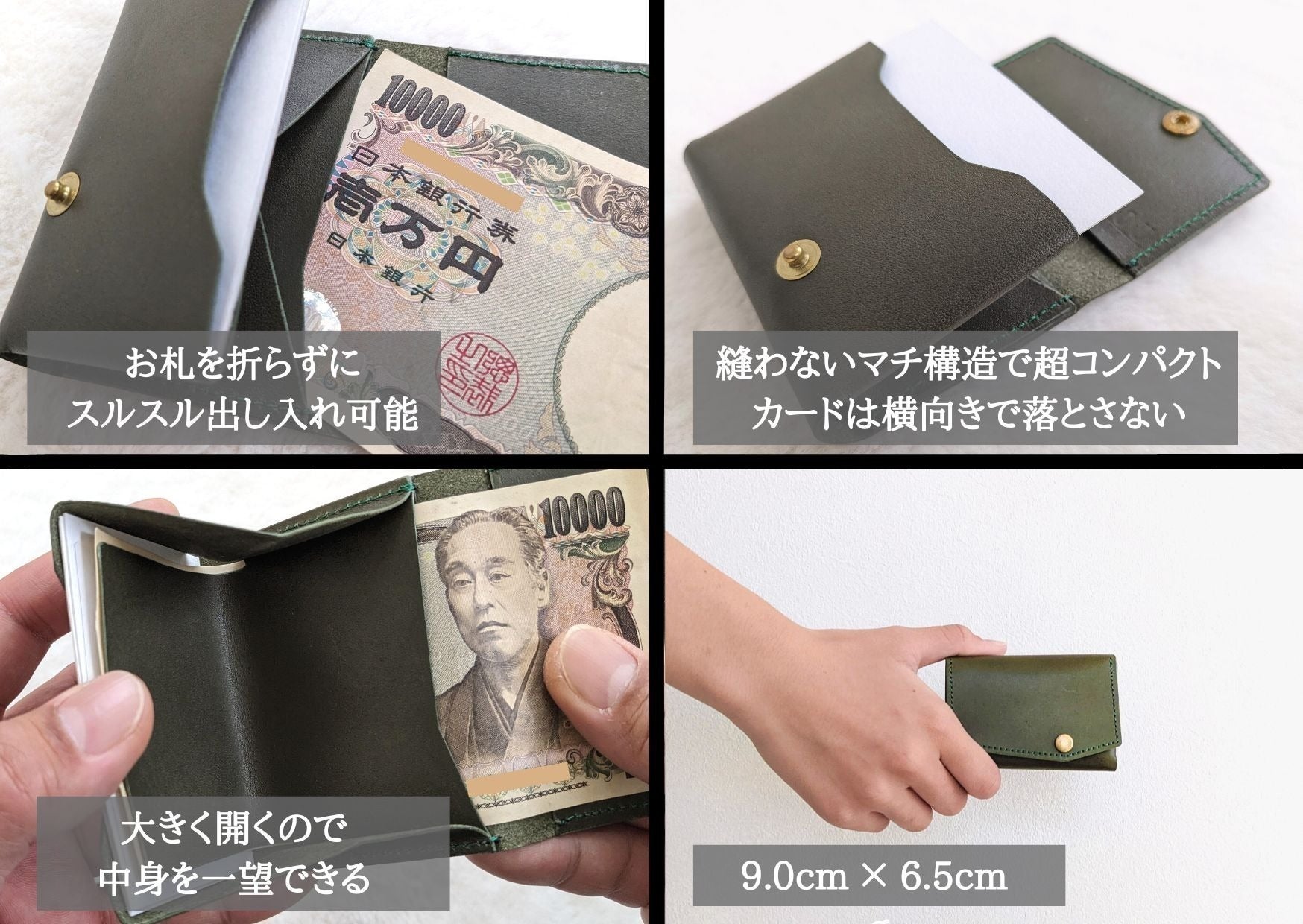 カード収納部のマチを縫わずに折り曲げ構造にすることで実現した、横幅がほぼカードサイズ(カード幅8.5cm、財布幅約9.0cm)の極小財布。