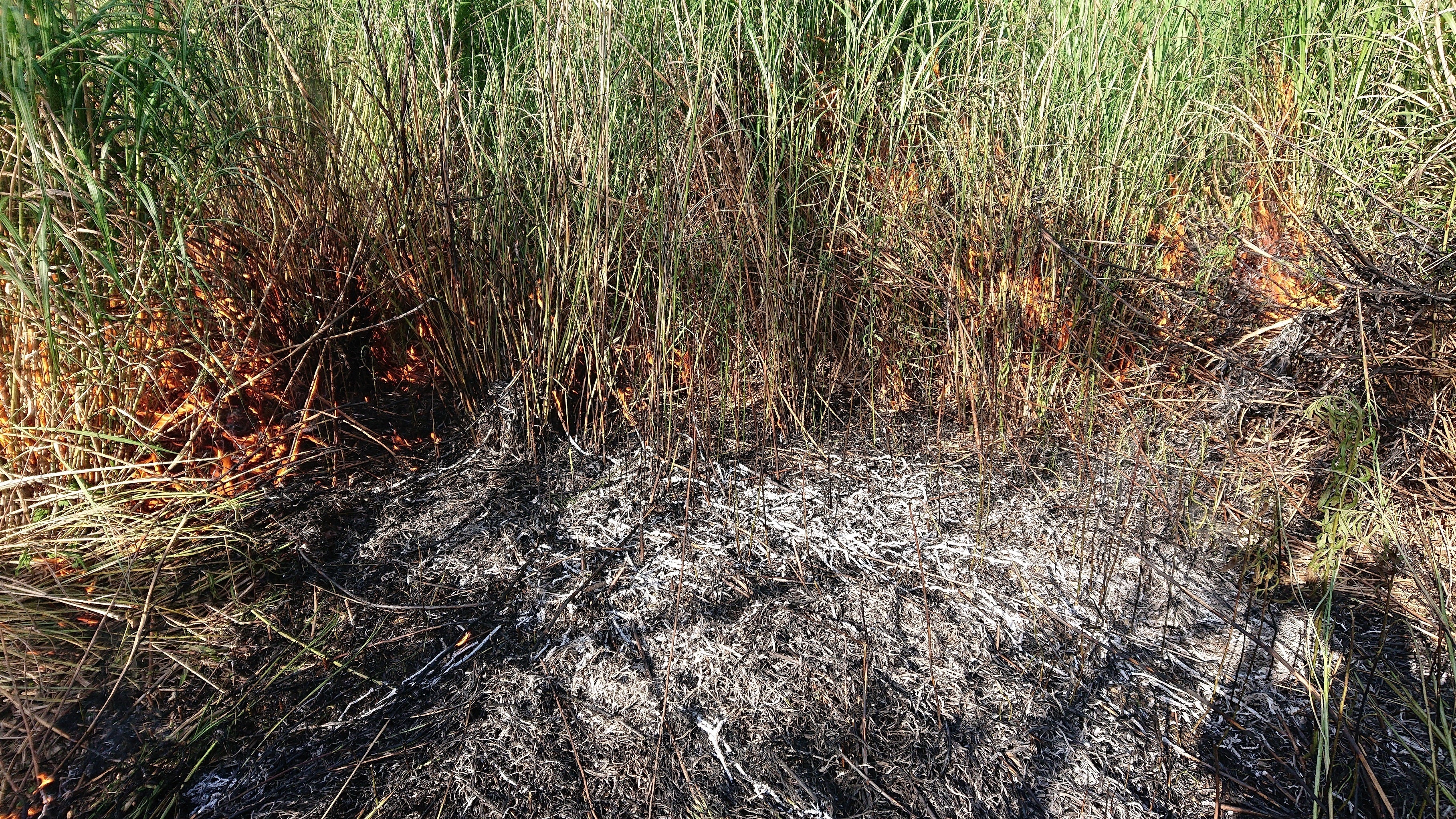 思ったより風が吹いて山火事になりそうでした、葉っぱが熱風で枯れてますね、危なかった…