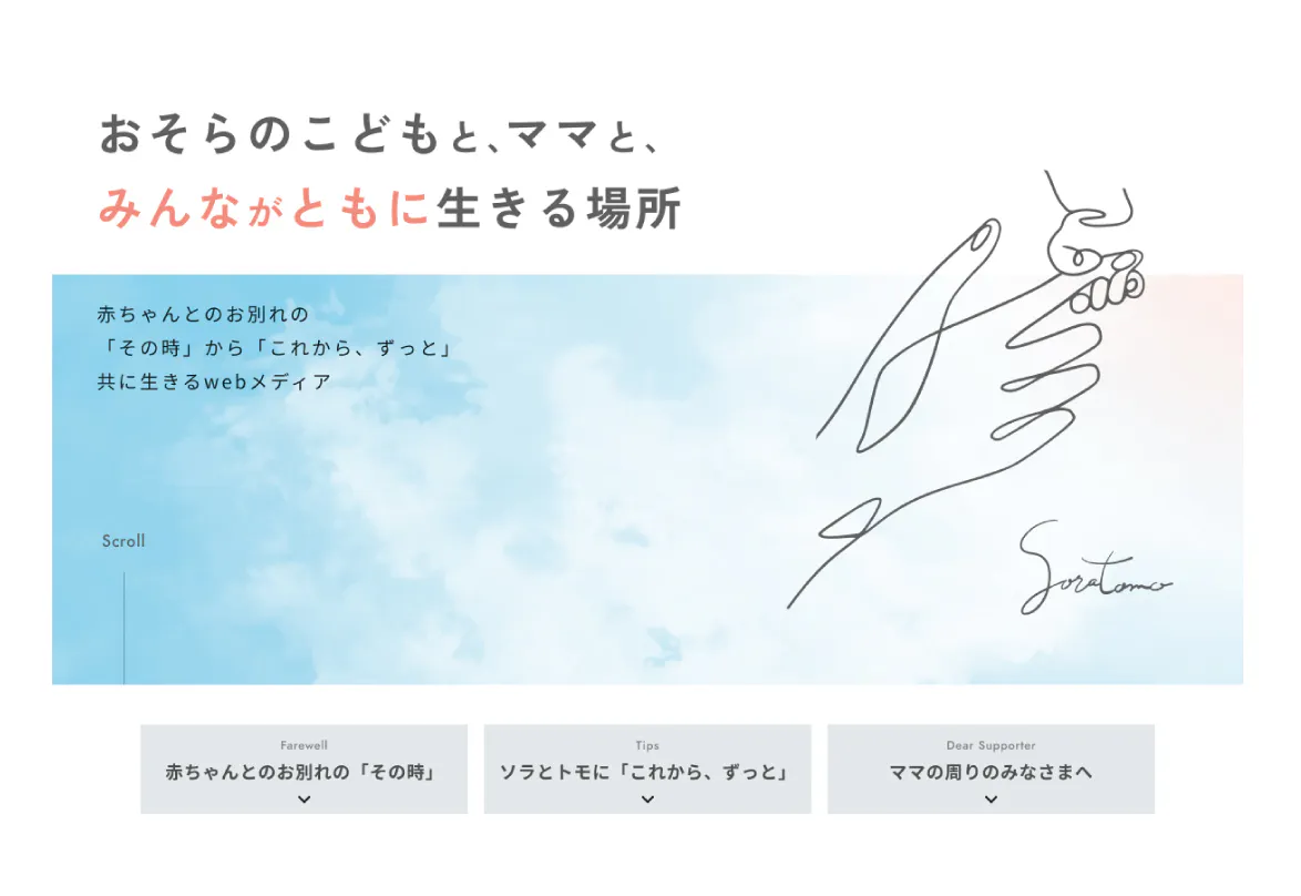 デザインや色味、文字のレイアウトなど細かなところまで、SORATOMOメンバーが意見を出し合い、サービス名「SORATOMO」の名の通り「空」にいる赤ちゃんとママが「共」に繋がっているイメージをそのままビジュアル化したTOPページとなりました。