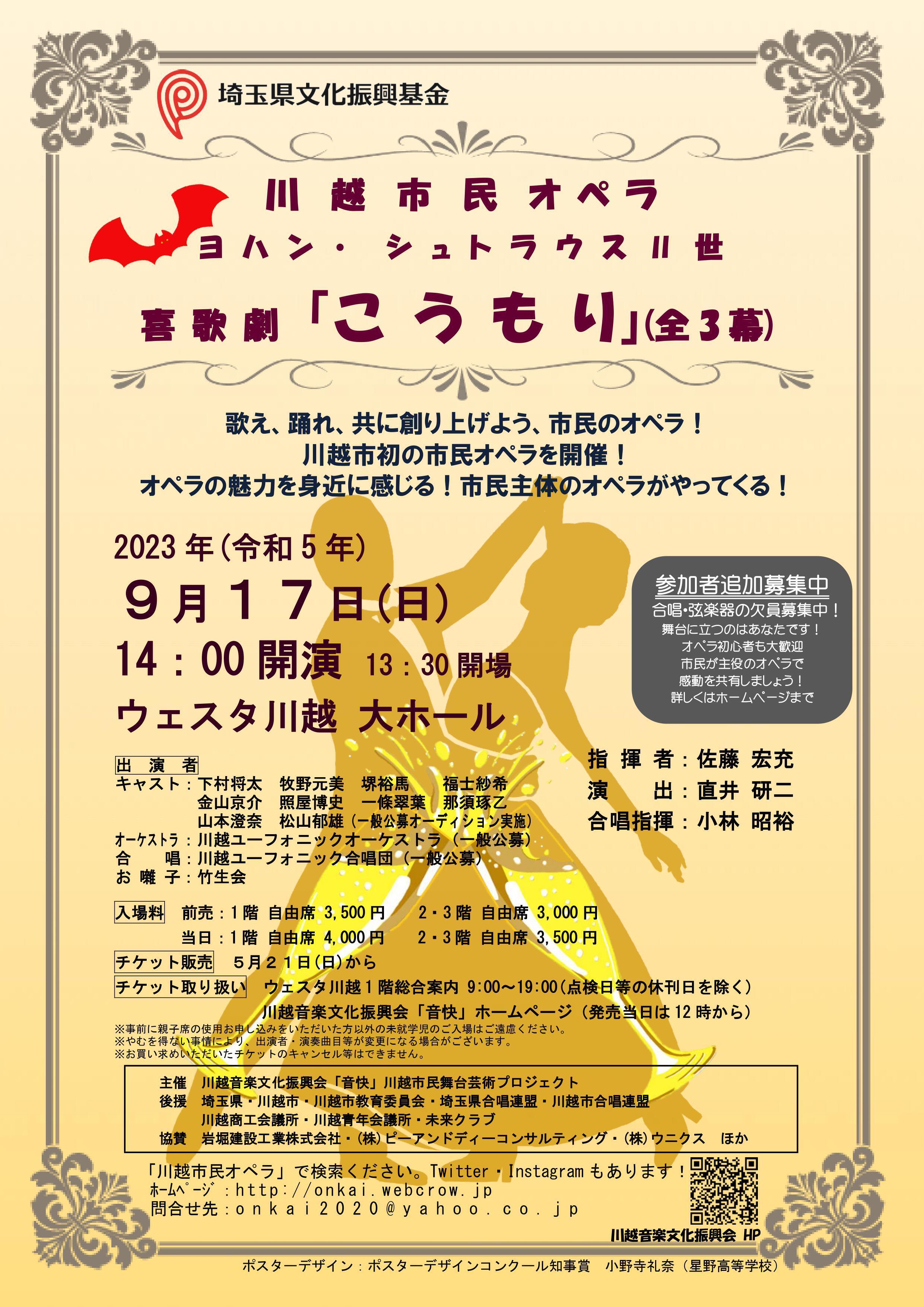 私たちは川越市の音楽文化の振興を目的として、川越音楽文化振興会「音快」を設立いたしました。2020年のオリンピックイヤーに、スポーツと共に音楽芸術も盛り上げていこうと、このオペラ公演の実現に向けてスタートしましたが、コロナウイルス感染症拡大のため延期を余儀なくされました。その後もコロナが収まる気配もなく、2021年も延期、2022年も再々延期になってしまいましたが、3年目の今年、2023年9月17日(日)やっと開催が決まり、現在参加者一丸となって公演に向け準備をしております。また、広報活動の一環として、出演者による広報演奏会を市内各所で積極的に展開しています。日本の歌や、ポピュラーソングなど、皆さんに馴染みのあるプログラムで好評いただいております。