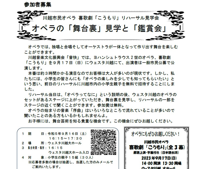 リハーサル当日は、「オペラってなに」という説明の後、ウェスタ川越のオペラのセットがあるステージに上がっていただき、舞台裏を見学し、リハーサルの一部をステージの近くで聞くことができます。参加費は無料です。