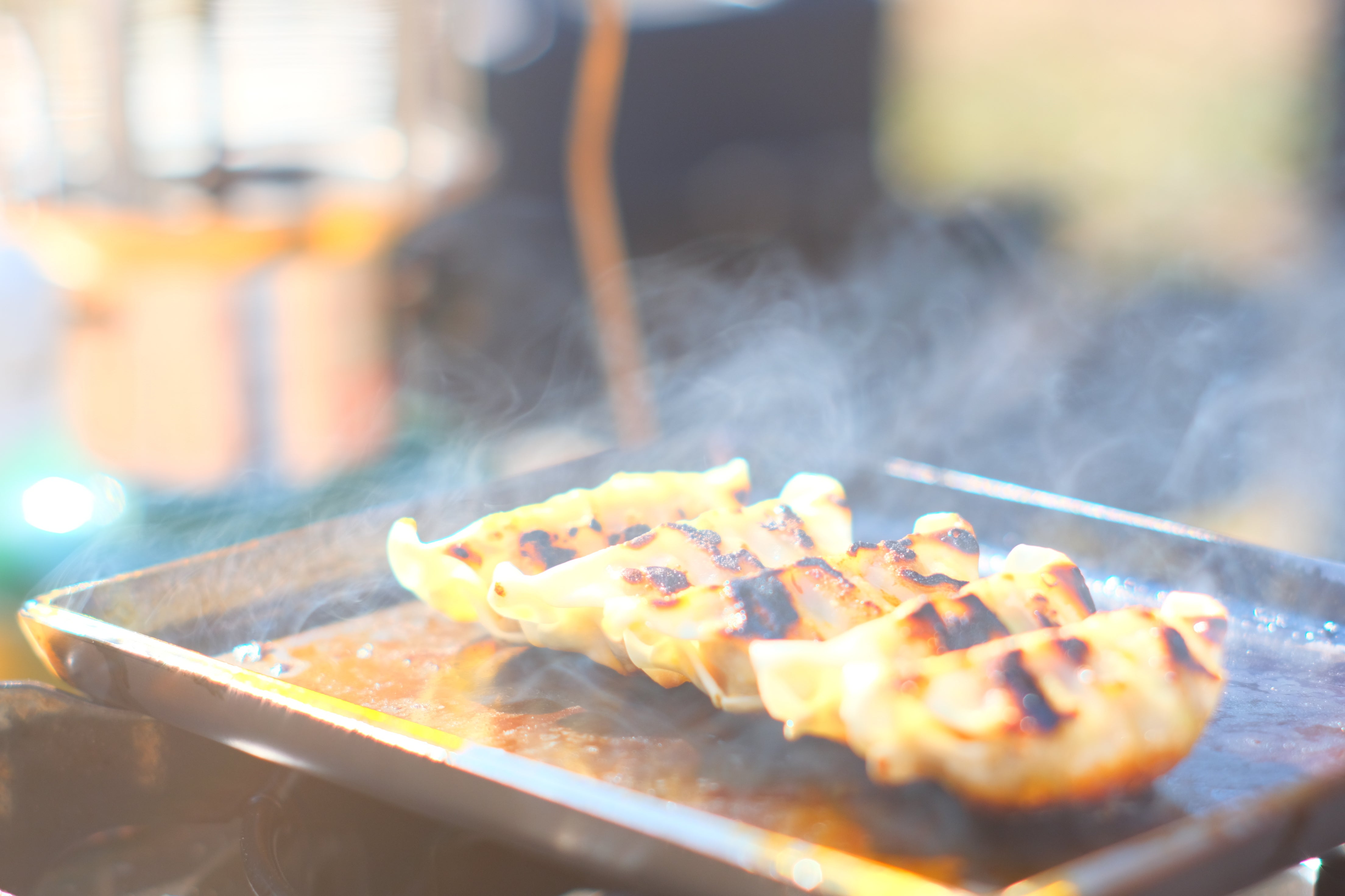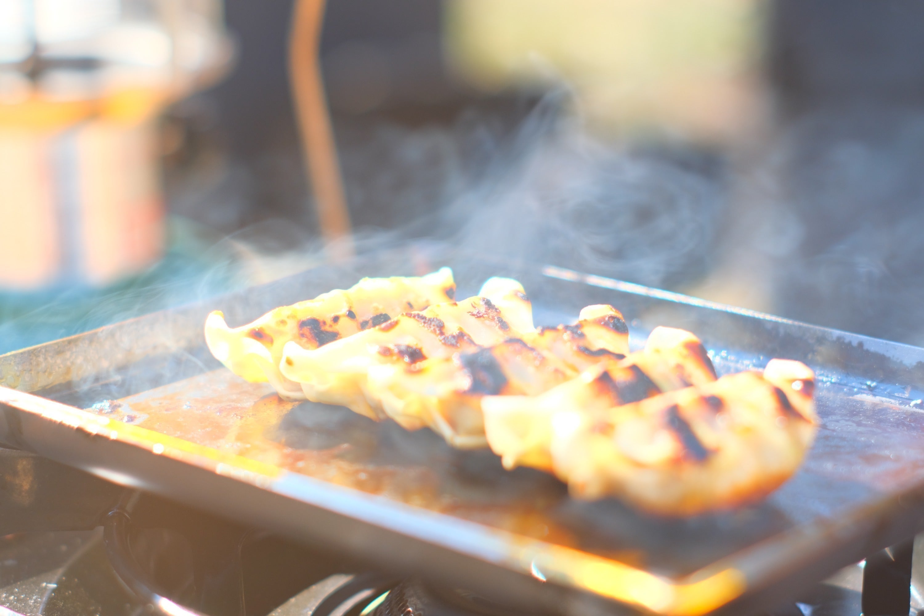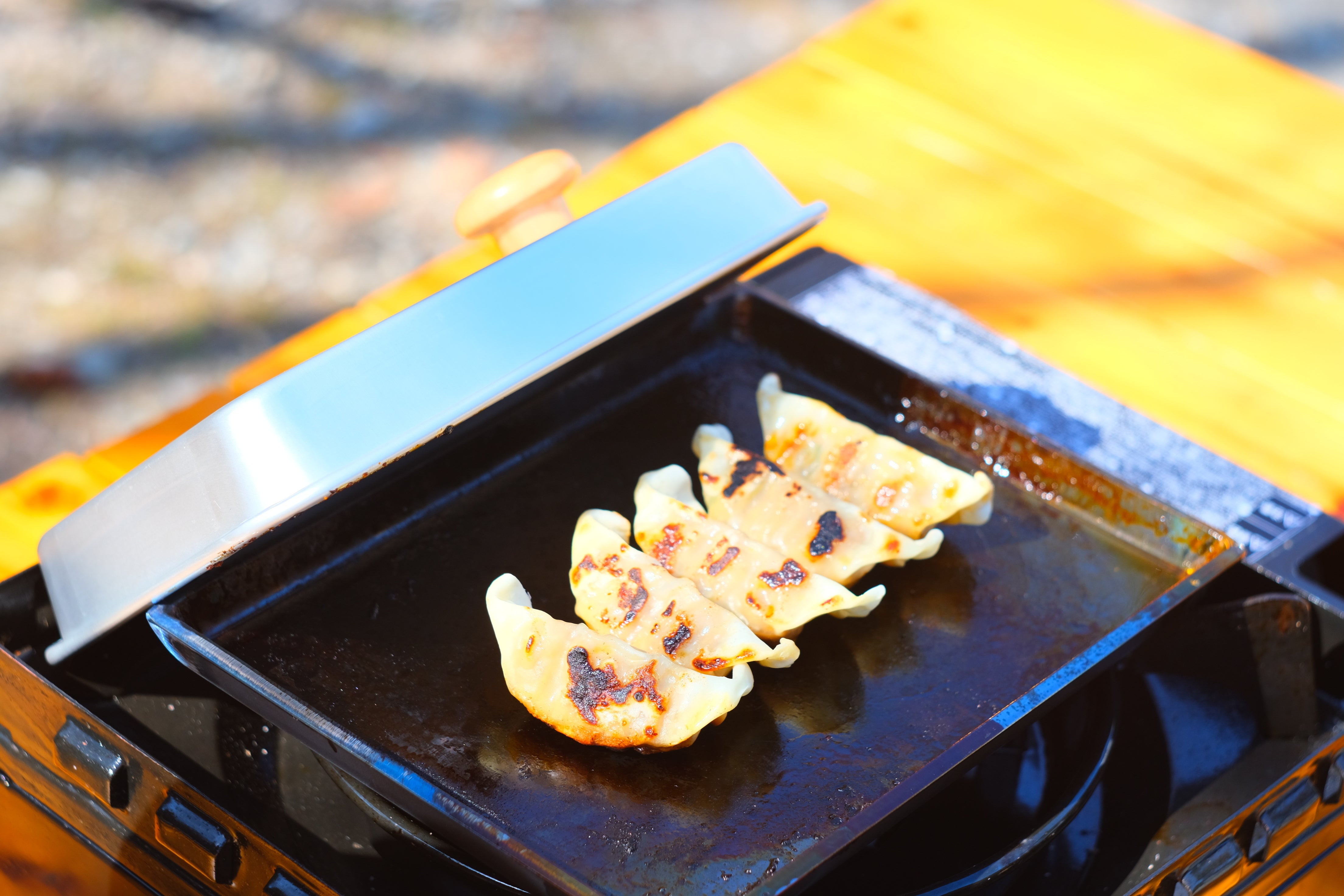 そもそもはキャンプ場でしっかり焼いた餃子を食べたかったことがきっかけで蓋つき鉄板を製作することに至りました。