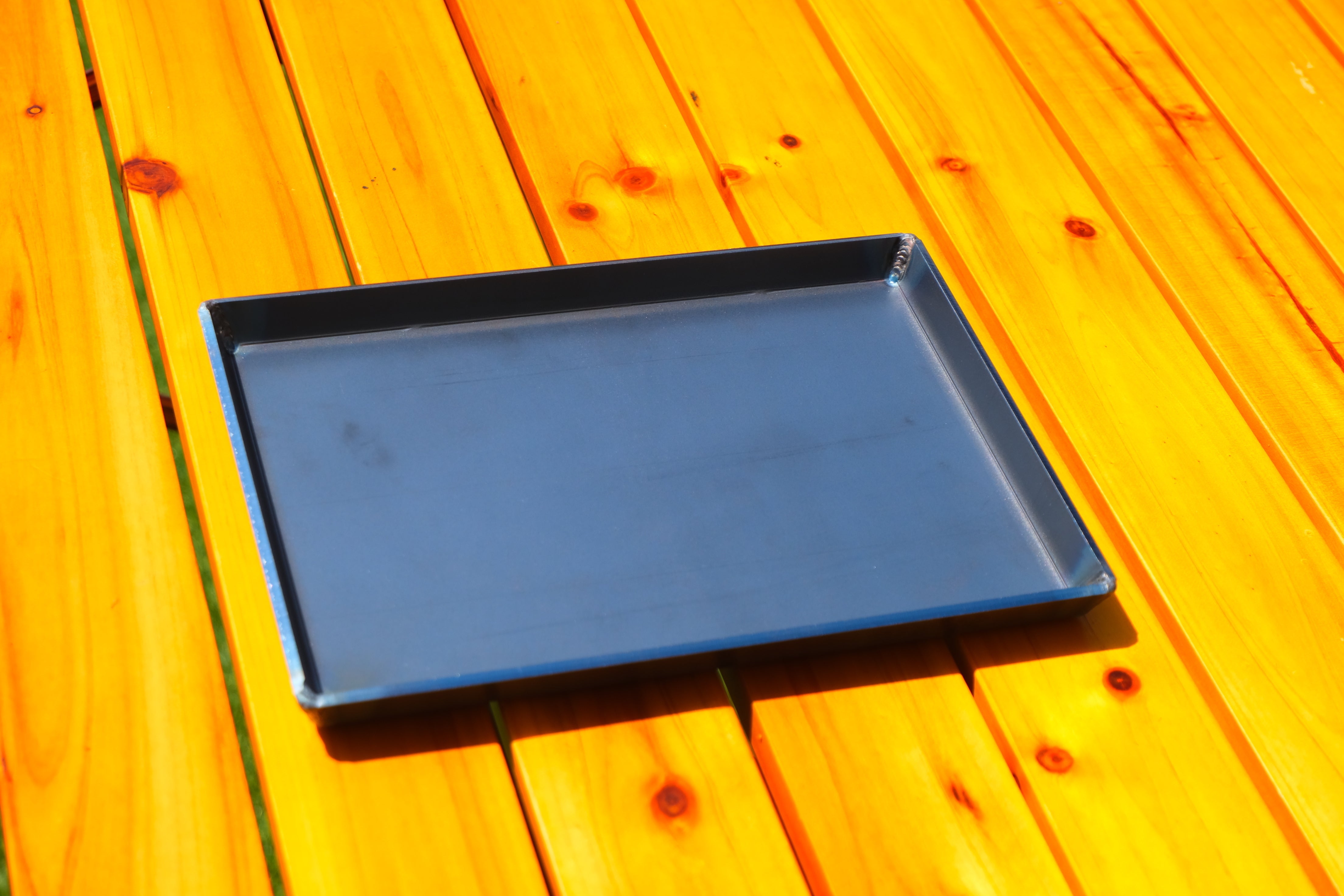 まずこの鉄板は一般的には黒皮鉄と言われる素材を使用しております。蓄熱性能が良く、食べ物を焼く際うまく火を通してくれます。IHコンロでの使用も可能で、縁の四隅を溶接し立ち上げていますので油や汁が落ちません。