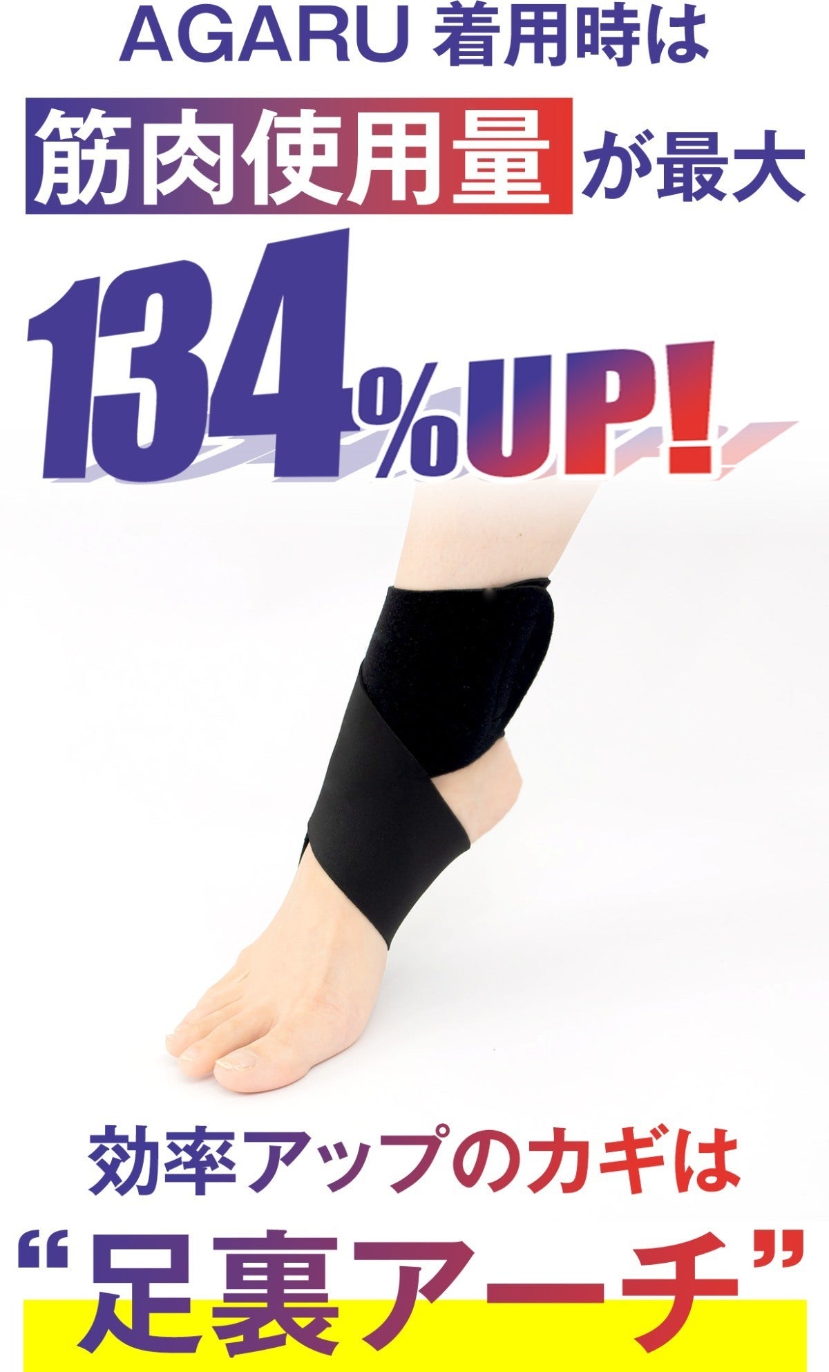 AGARU(アガル)を着けて かかとをキュッと引き締め、足裏をしっかり持ち上げる。