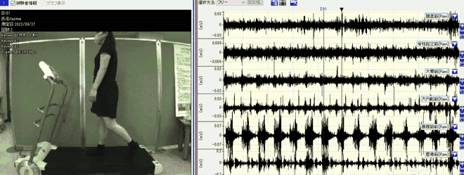 実際にAGARUを未装着の状態・装着した状態でウォーキングし、筋電測定実験を行い比較したところ