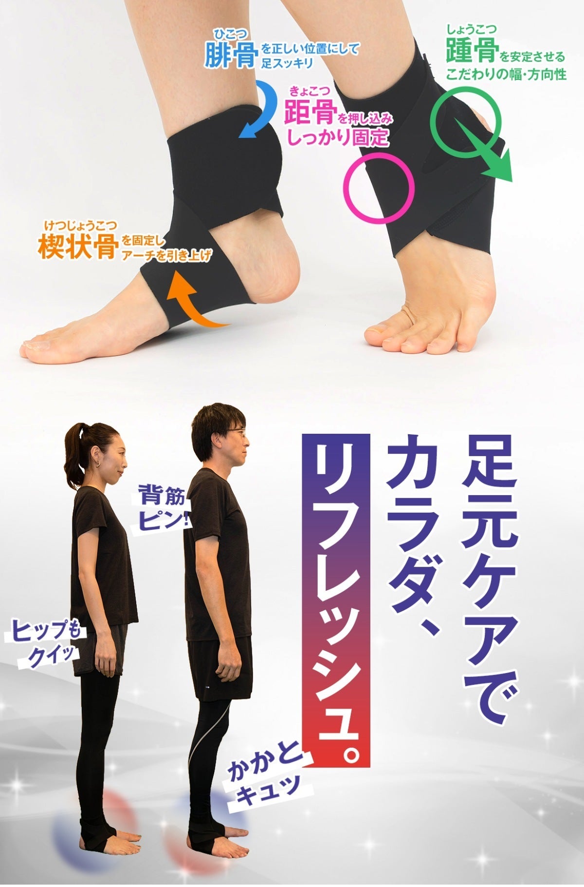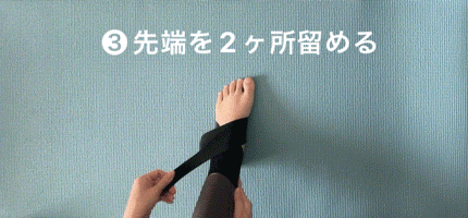 足首を固定することで足首のぐらつきを抑え、かかとの内反(内側にひねること)・外反(外側にひねること)を抑制し、