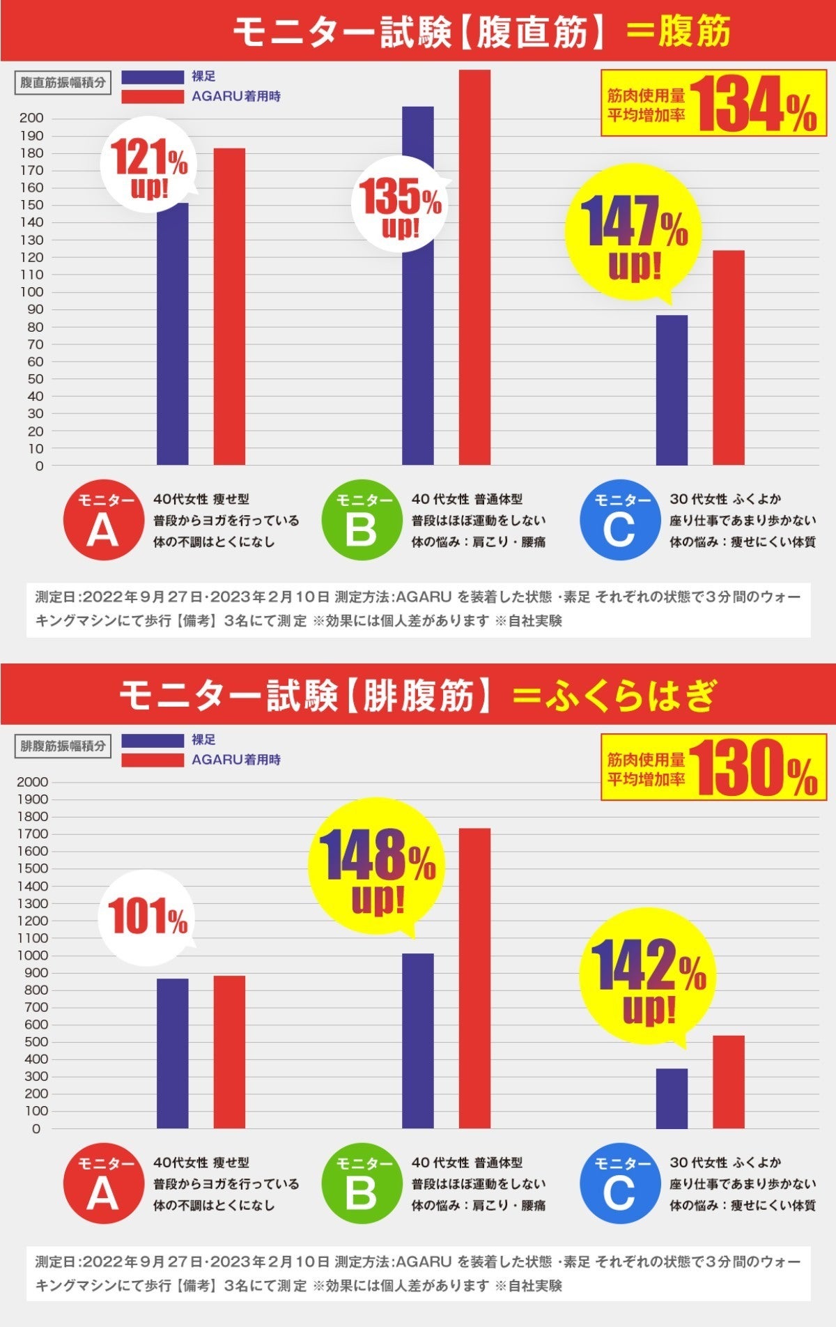 装着時はで平均134%も筋肉使用量がアップしていることがわかりました!