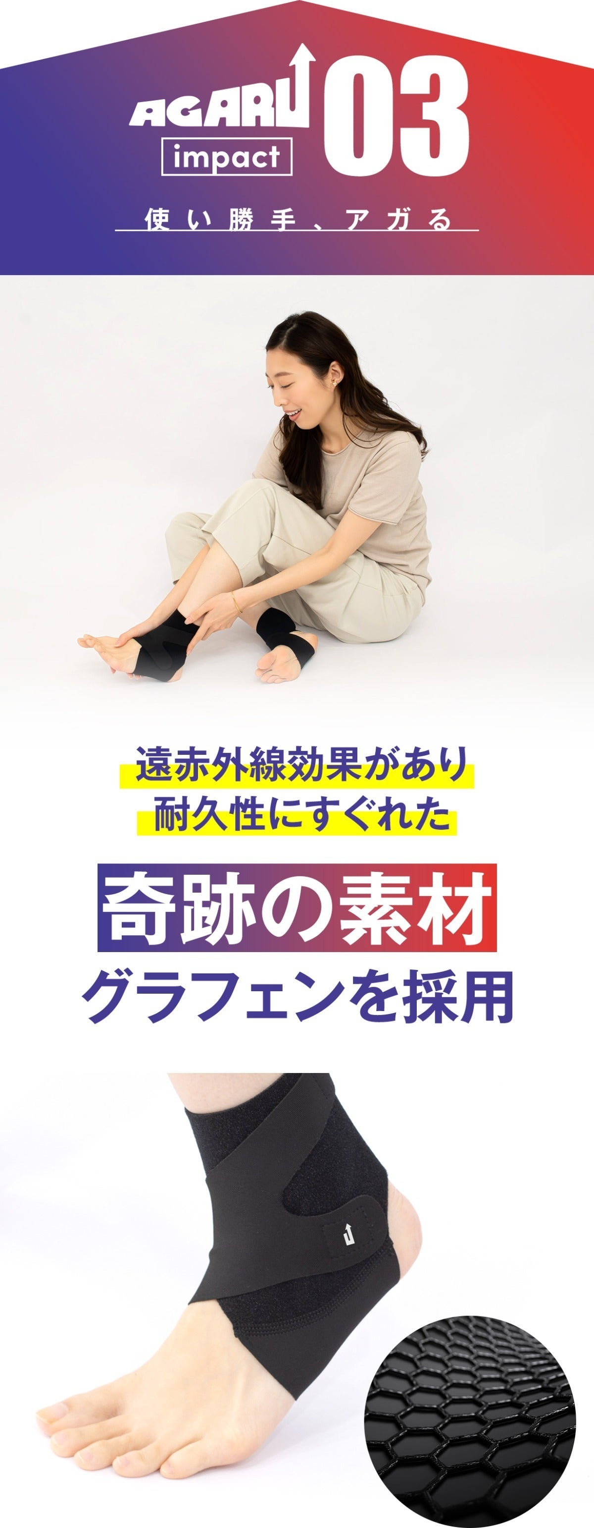 サポーターの素材には、奇跡の素材とよばれる「グラフェン」を使用。