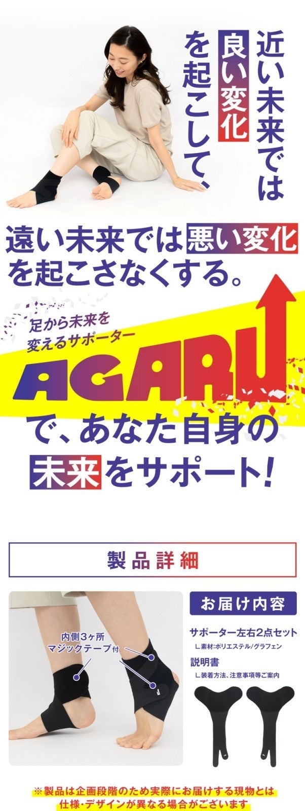 2023/06/01 09:14ご支援者のみなさま愛知県豊川市にある寝具・インテリアのメーカー、マックスファンシーです。弊社が約1ヶ月にわたりお送りしてきた、足サポーター『AGARU』が目標を520%達成し、64人の方にサポートしていただく形で無事プロジェクトを終えることができました!引き続き、お客様のお手元にお届けができるよう手配を進めております。発送まで今しばらくお待ちいただけますと幸いです。 支援購入いただいた方、暖かい支援コメントをいただいた方、すべてのサポーター様に感謝申し上げます。本当にありがとうございました! もっと見る\まもなく終了/AGARUの受付はあと1日です!