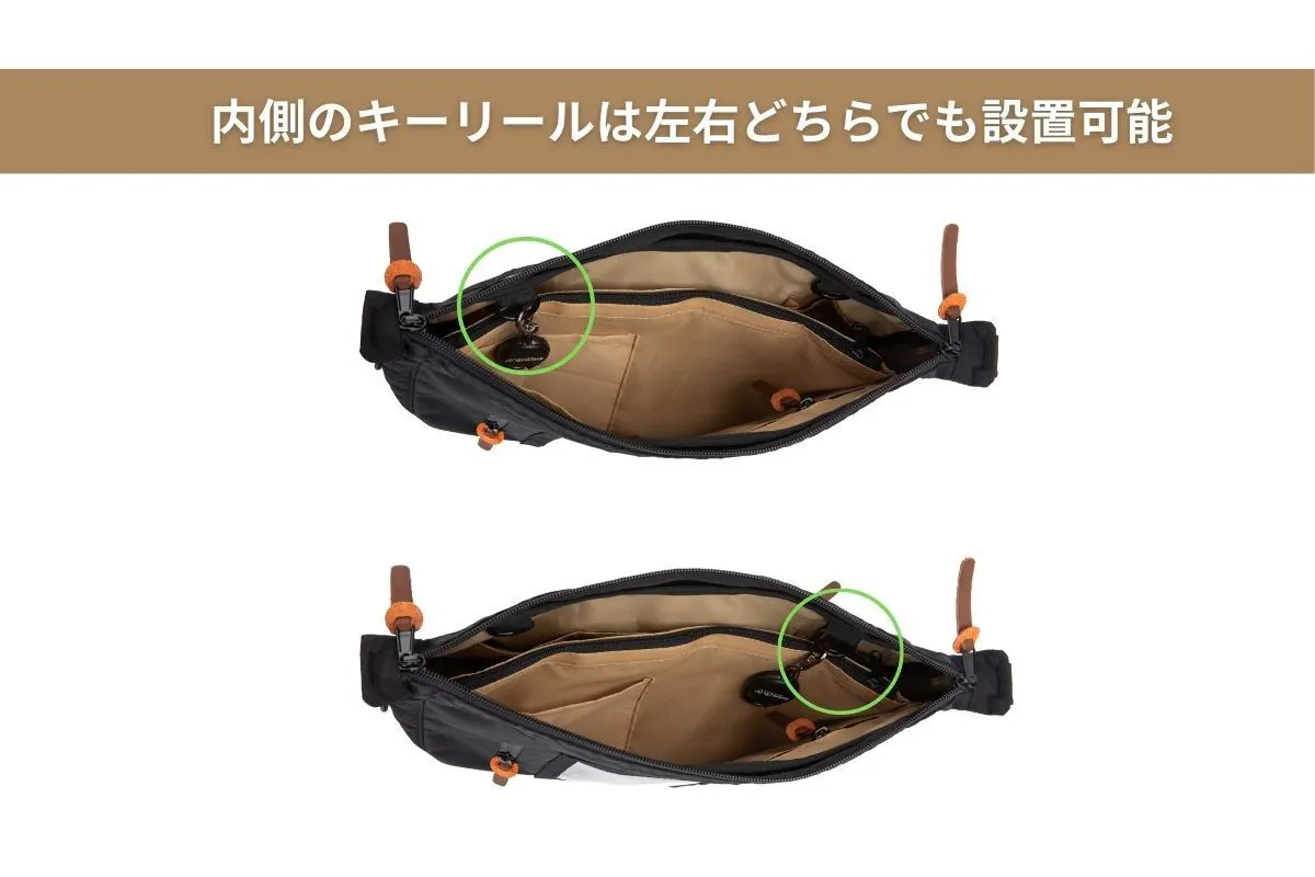 内側には左右両方にDカンを設置し、どちら側にもキーリールをつけられるようにしています。