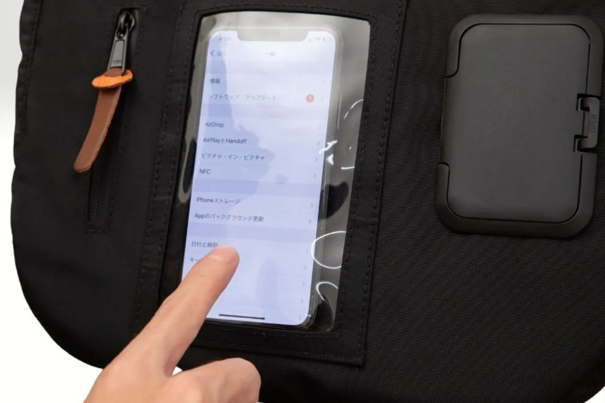 6.1インチまでのスマホがすっぽり入るスマホポケットには、PVCを採用。カバンに入れたまま操作ができるので、濡れた手で使えるのも嬉しいポイント。