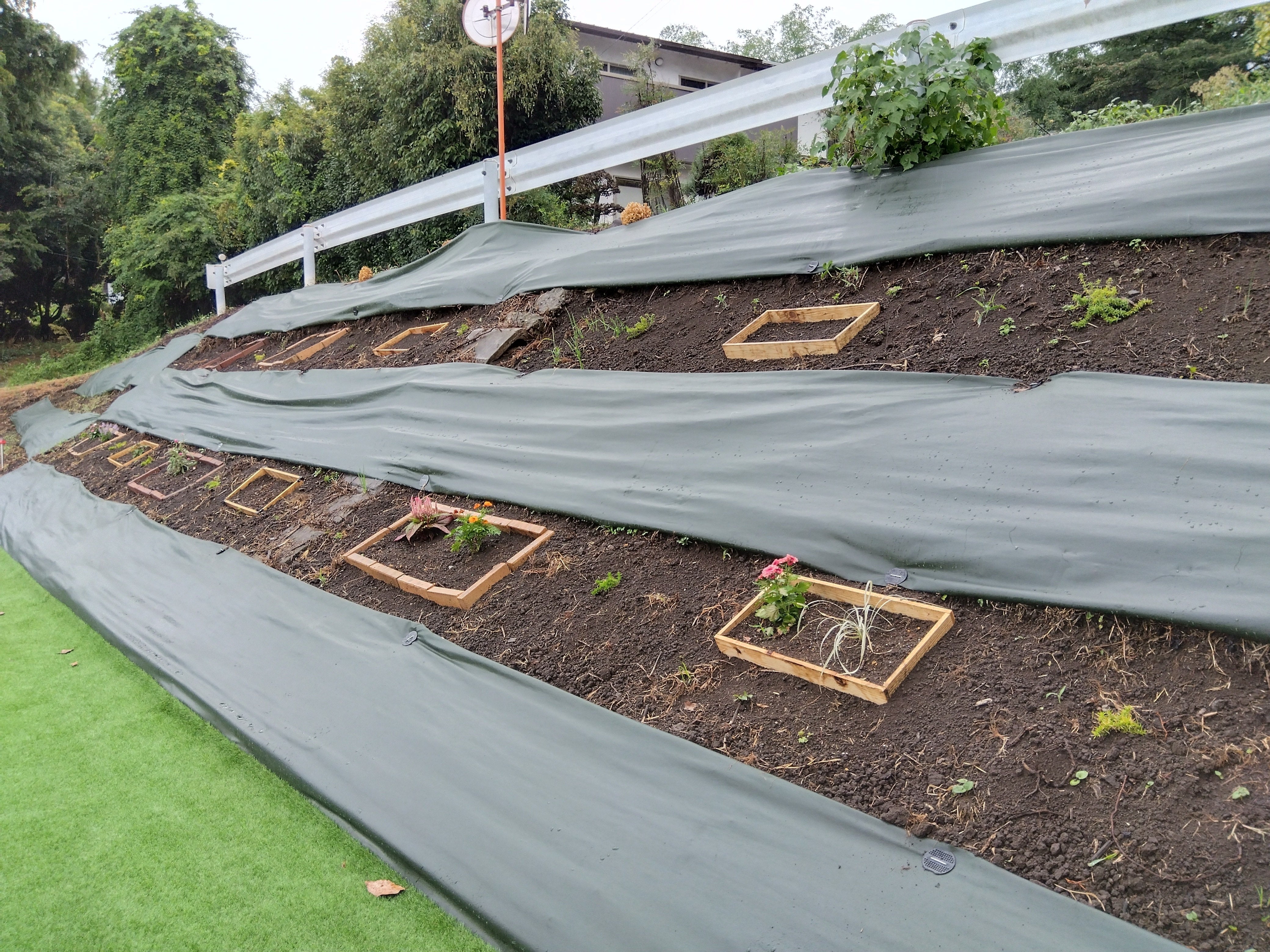 雑草と共生するために、防草シートを3列と2列に分けて敷いています。防草シートの間を花壇として利用します。そこに木の枠とレンガの枠を埋めて区分けしています。