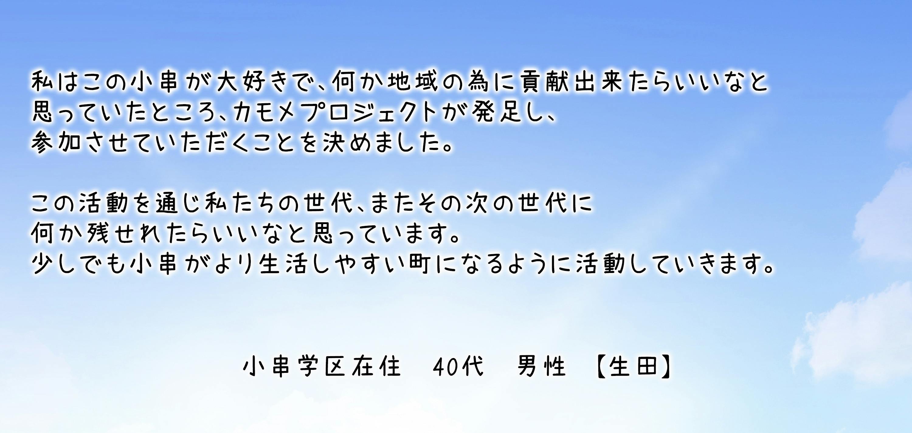 私はこの小串が大好きで、何か地域の為に貢献出来たらいいなと思っていたところ、カモメプロジェクトが発足し、参加させていただくことを決めました。