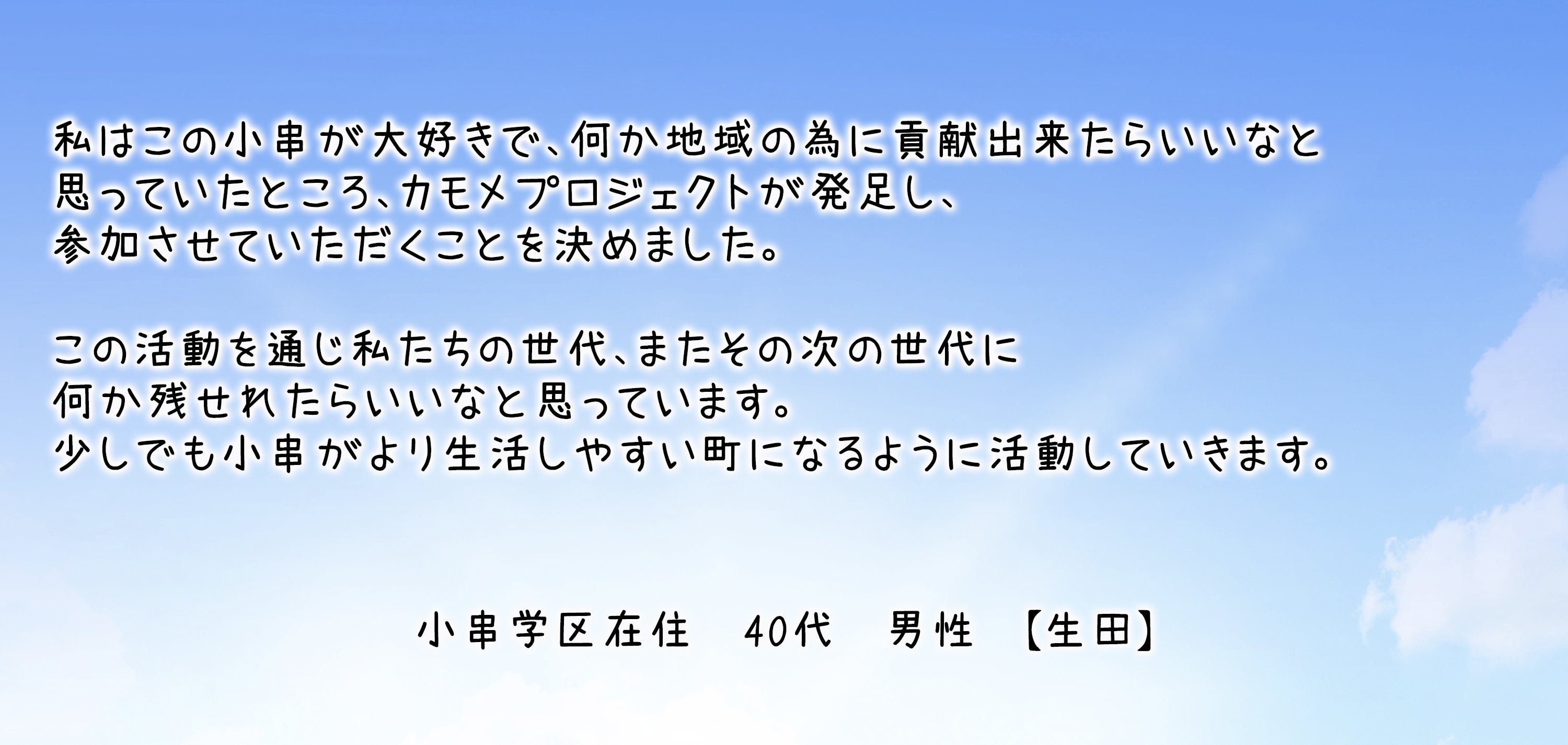 私はこの小串が大好きで、何か地域の為に貢献出来たらいいなと思っていたところ、カモメプロジェクトが発足し、参加させていただくことを決めました。