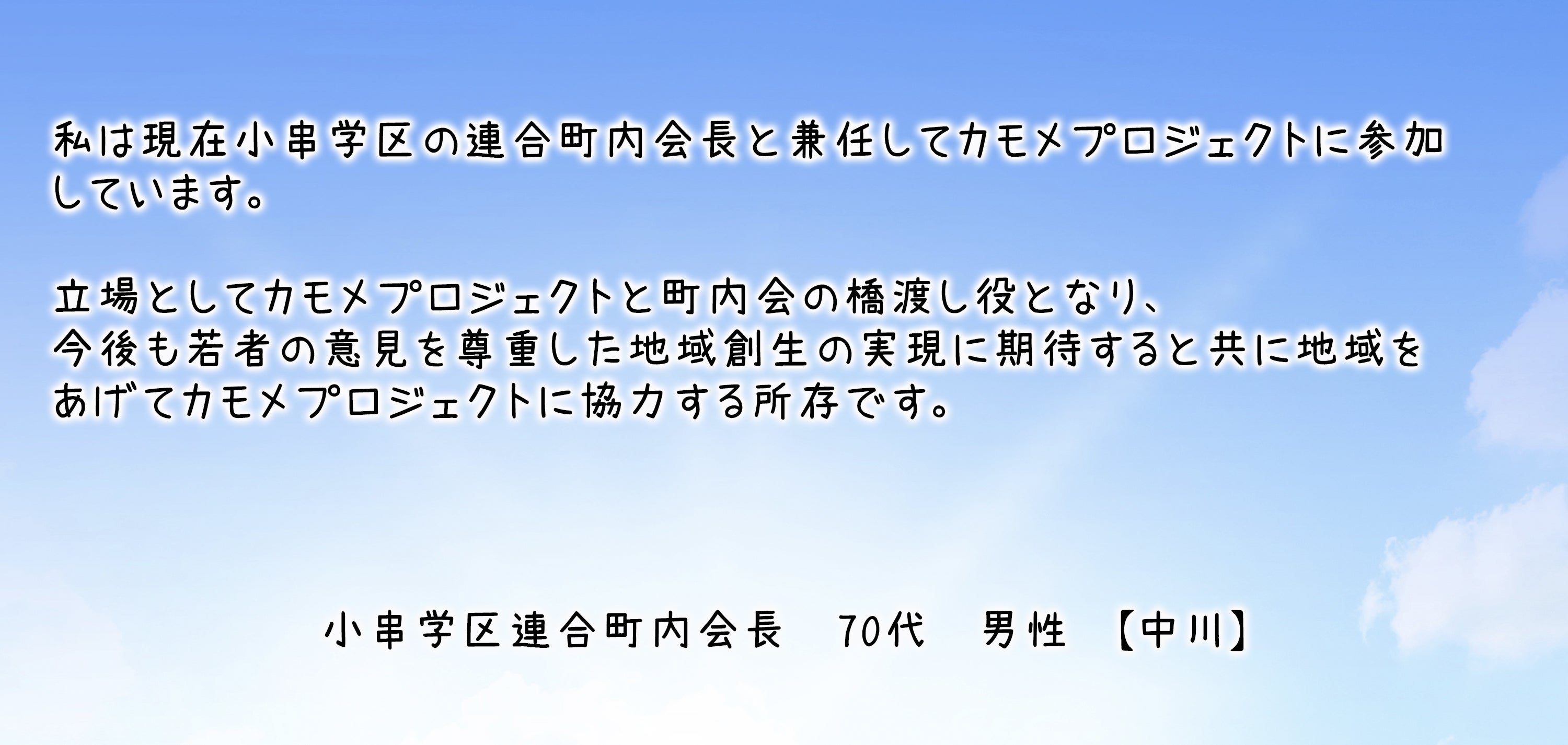 立場としてカモメプロジェクトと町内会の橋渡し役となり、今後も若者の意見を尊重した地域創生の実現に期待すると共に地域をあげてカモメプロジェクトに協力する所存です。