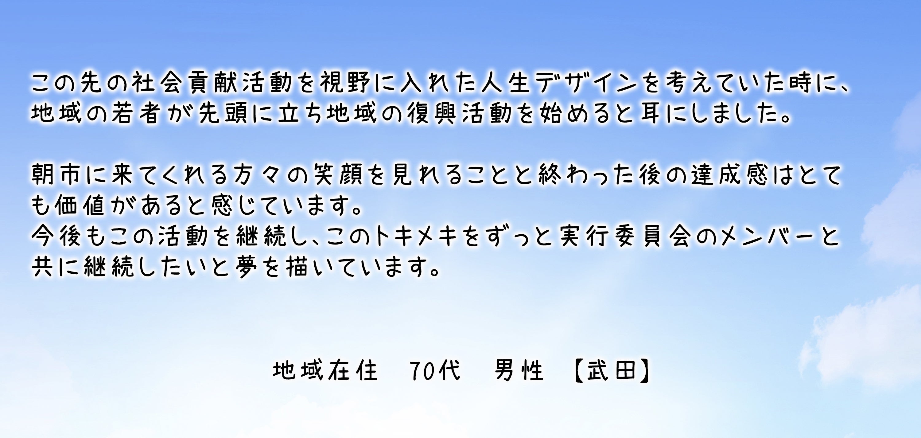 しかし、朝市に来てくれる方々の笑顔を見れることと終わった後の達成感はとても価値があると感じています。