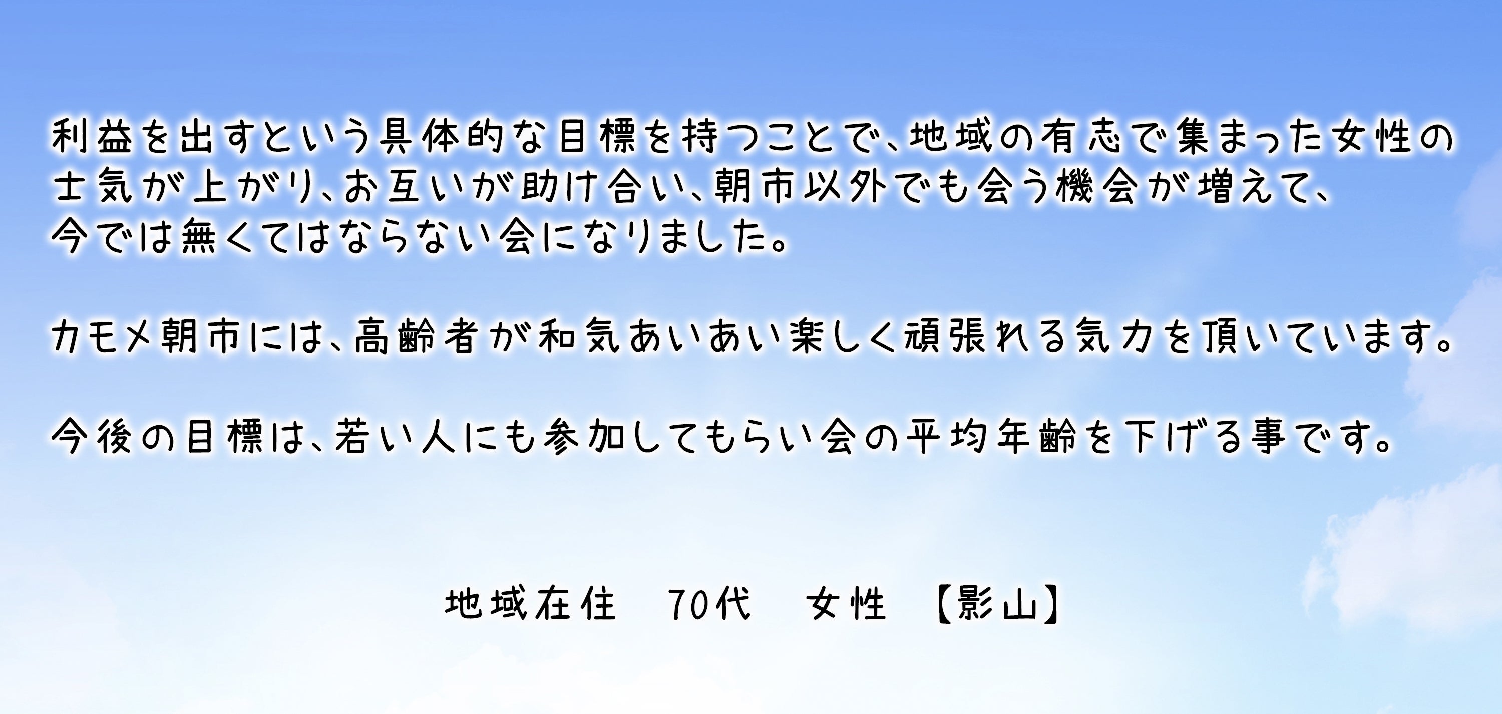 カモメ朝市には、高齢者が和気あいあい楽しく頑張れる気力を頂いています。