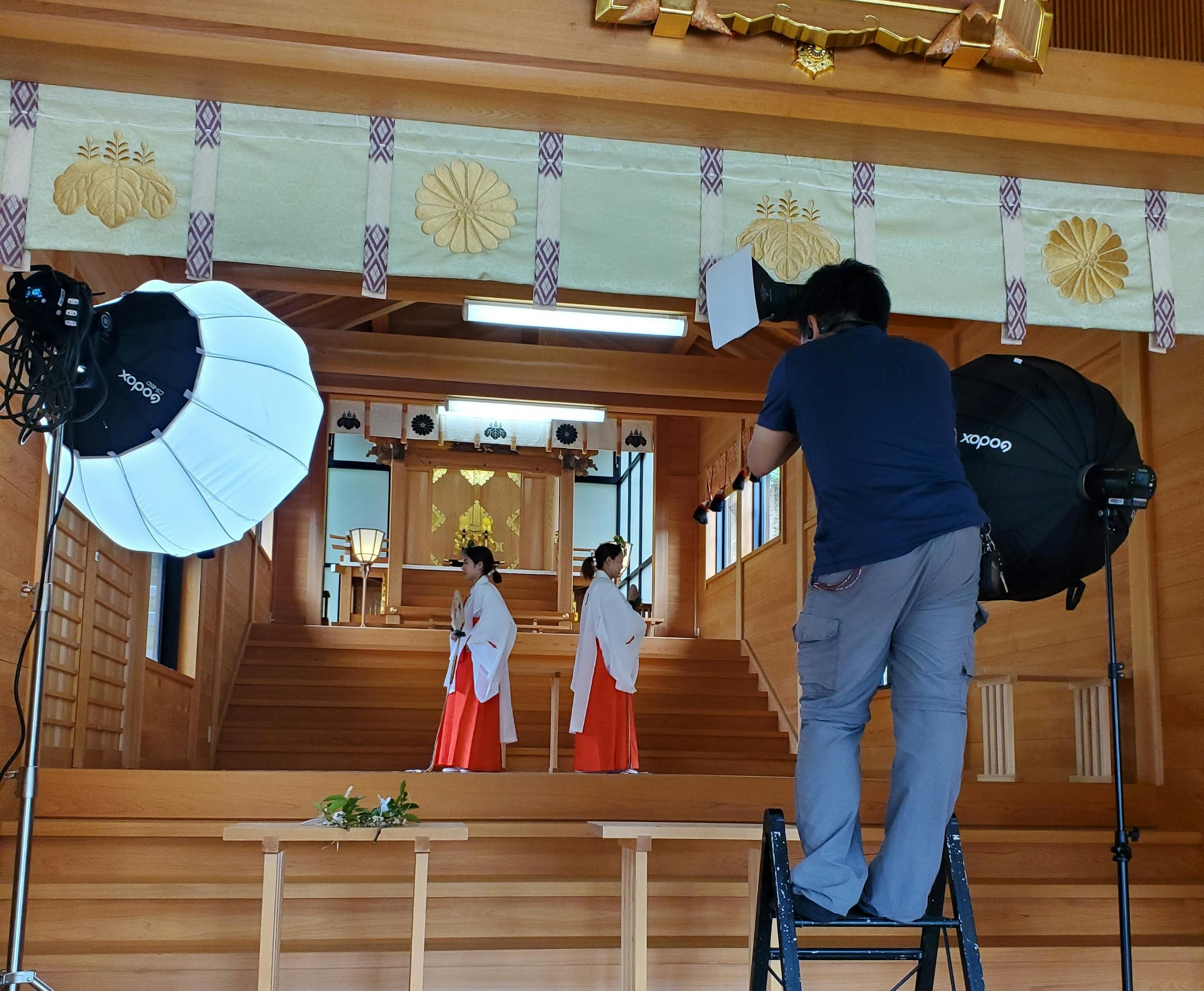 本来の巫女の姿が伝わるよう、巫女舞経験のある巫女さんに、実際に舞いを舞ってもらいながらの撮影となりました。