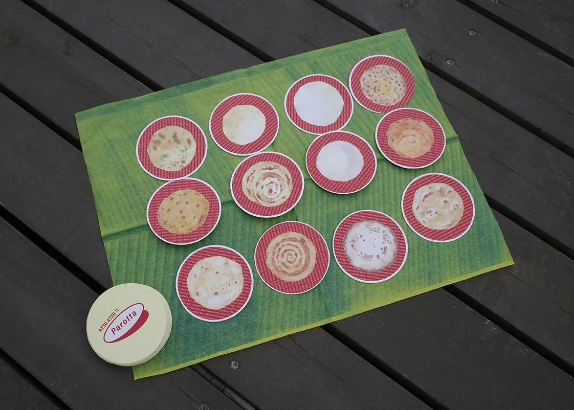 「ATSU ATSU!! Parotta」は、手持ちのカードと場にあるカードを入れ替えながら同じ種類のインドパンとカレーの組を早く揃えていくスピード系のゲームです。インドパンはたくさんの種類があり、とてもまぎらわしいので注意しながら集めましょう。
