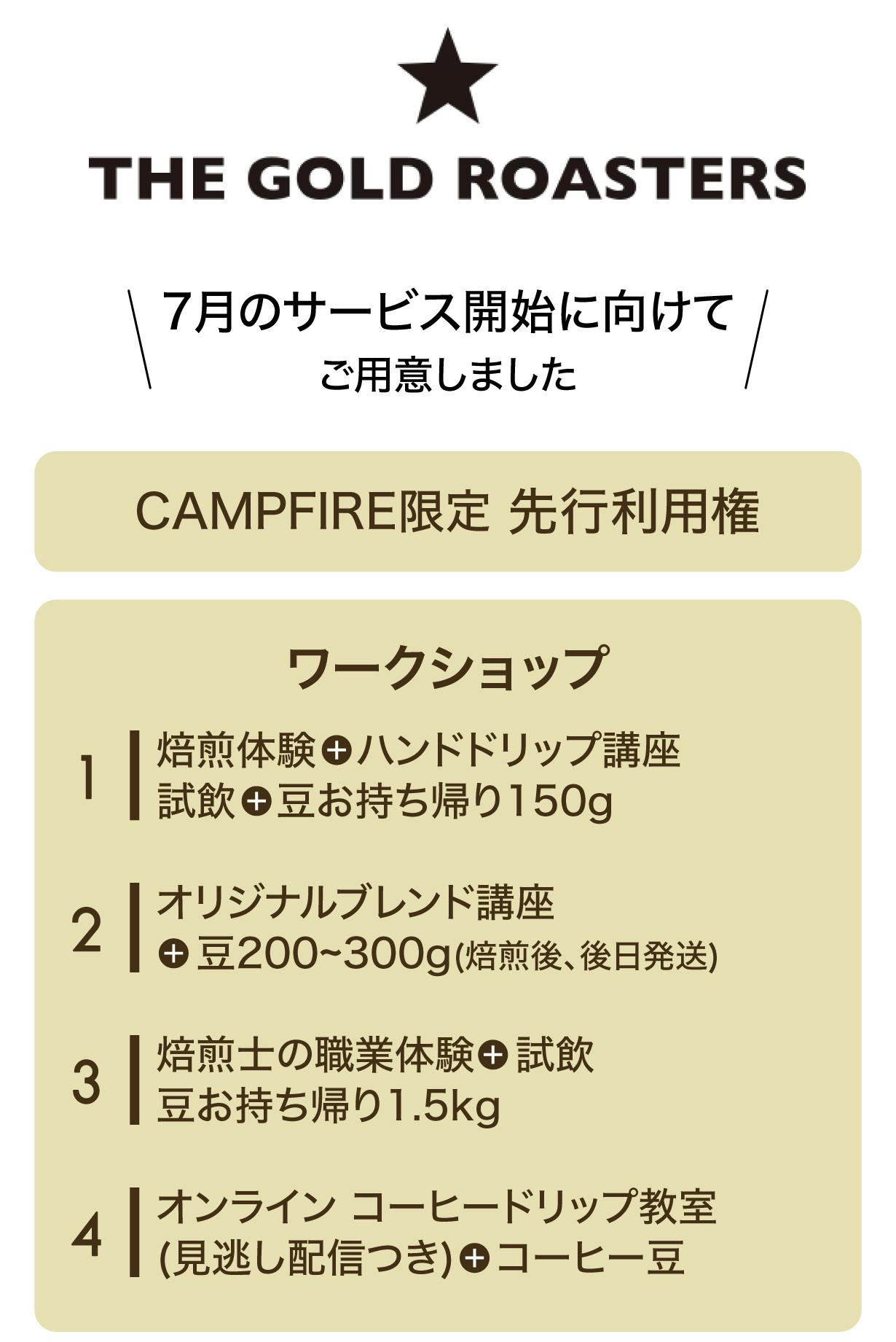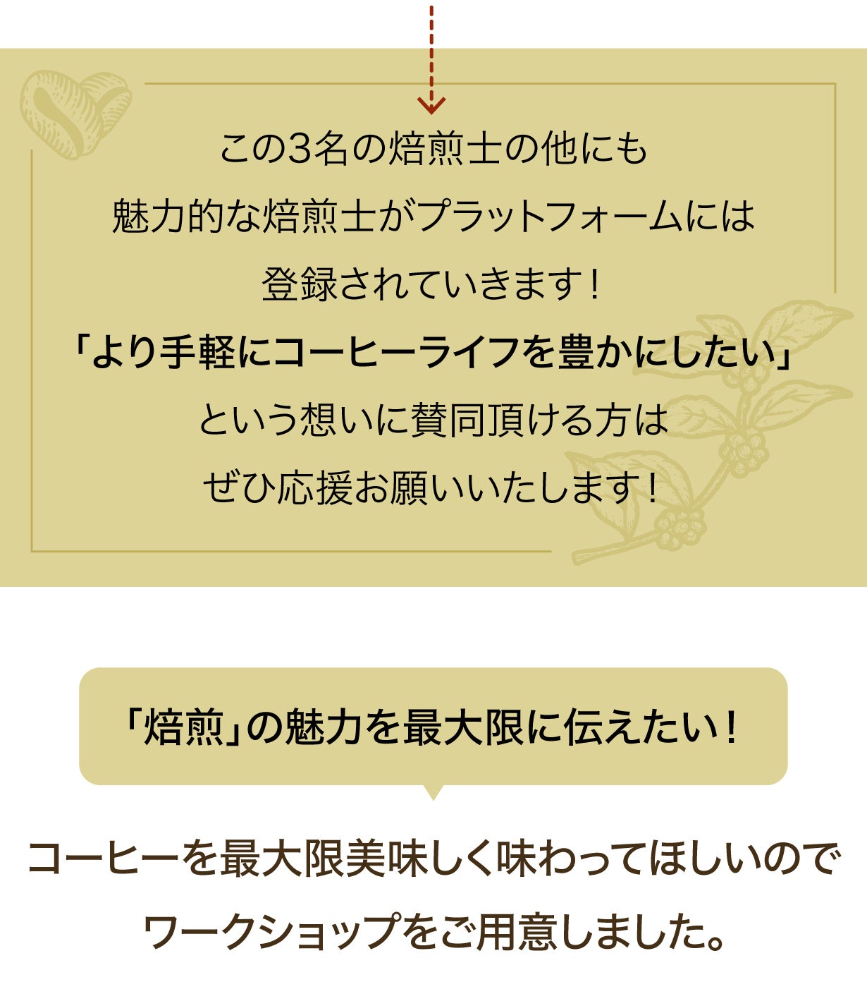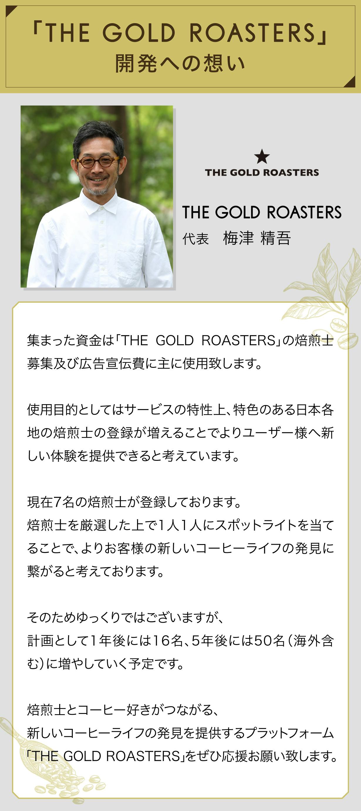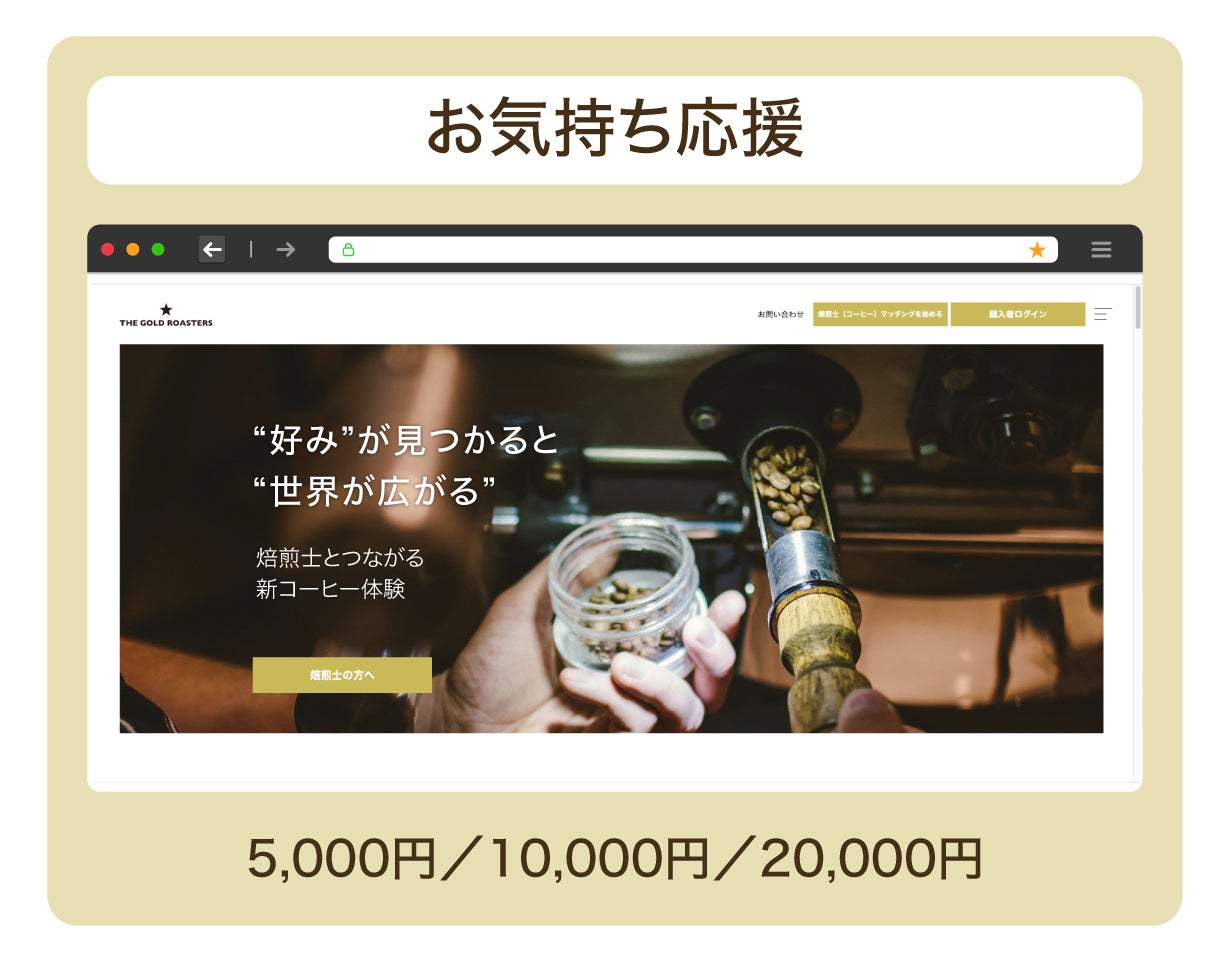 「お気に入りの焙煎士を見つけて交流して自分のことを知ってもらった上で焙煎士が焙煎するから生まれる価値」を実現するのがTHE GOLD ROASTERSの役割です。あなたの支援によって多くの日本に眠っている焙煎士の人材にスポットライトを当てる事が出来ます!そしてそれが必ずお客様にとっての豊かな生活の一助になるという想いで立ち上げておりますのでぜひ応援お願い致します。
