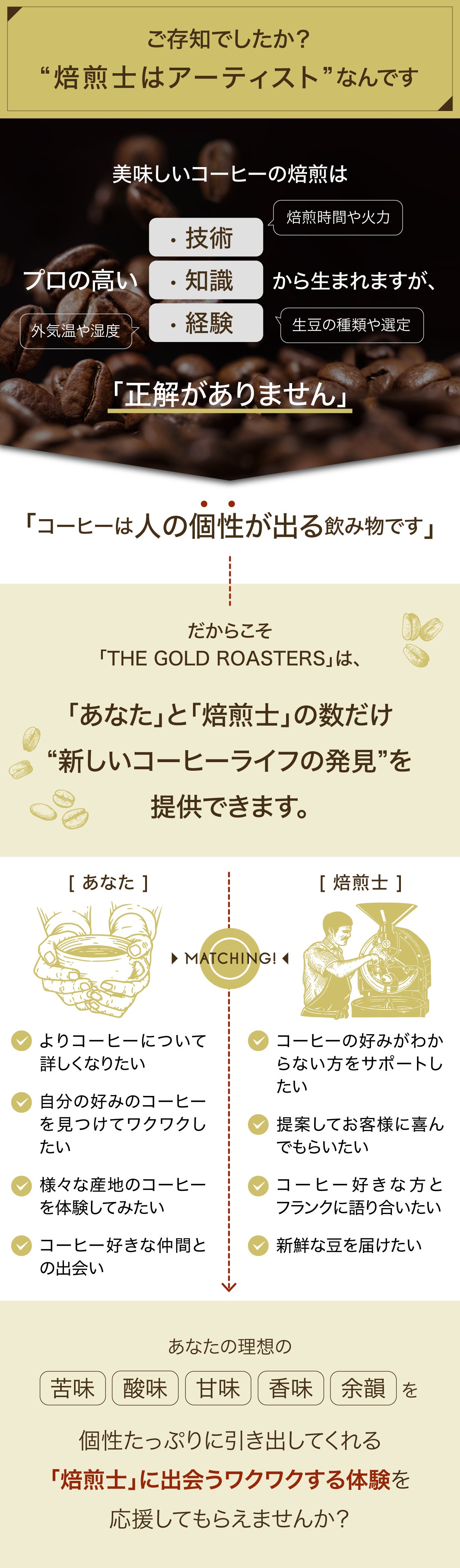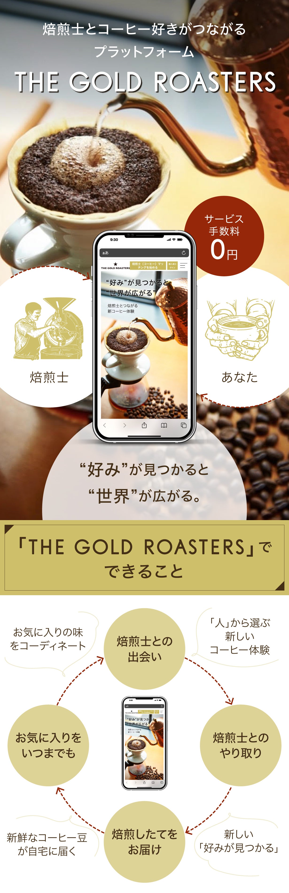 THE GOLD ROASTERS」は新しいコーヒー体験を求めるあなたと「焙煎士」を繋ぐプラットフォームです。