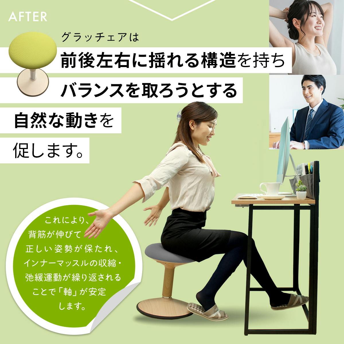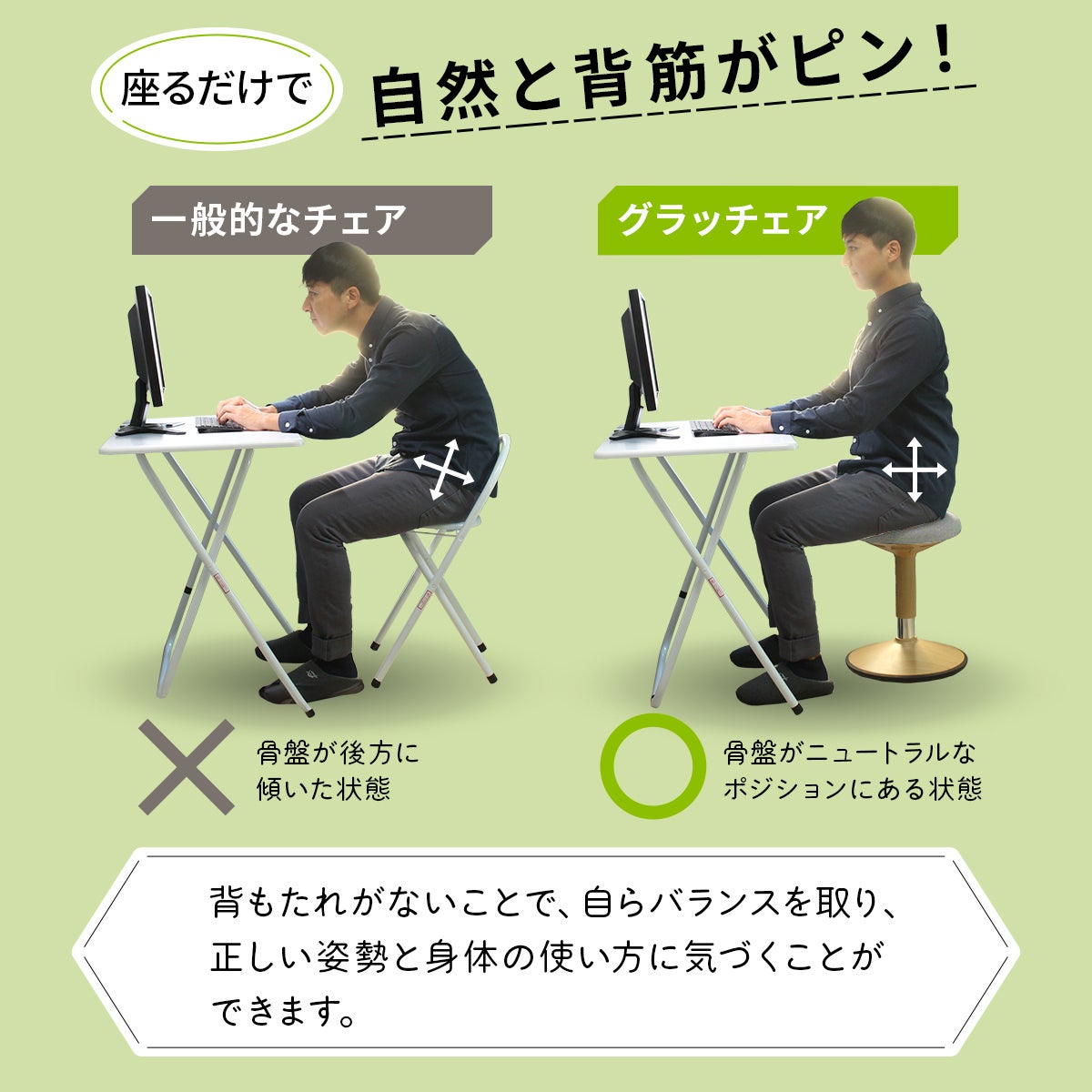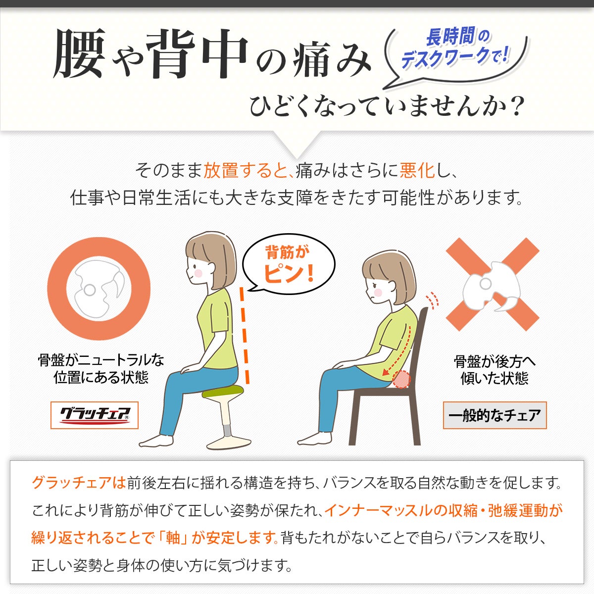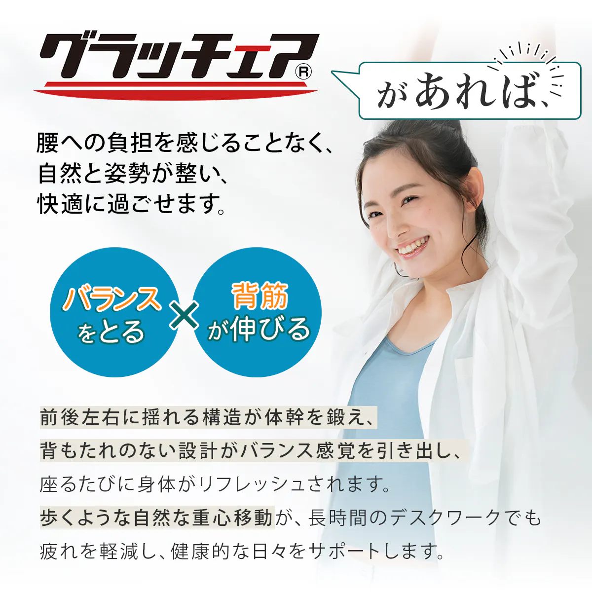 「グラッチェア」なら普段のオフィスワークでフィットネスジムに通っているように体幹筋が鍛えられ、腰や肩のつらさに負けない体が作れます。