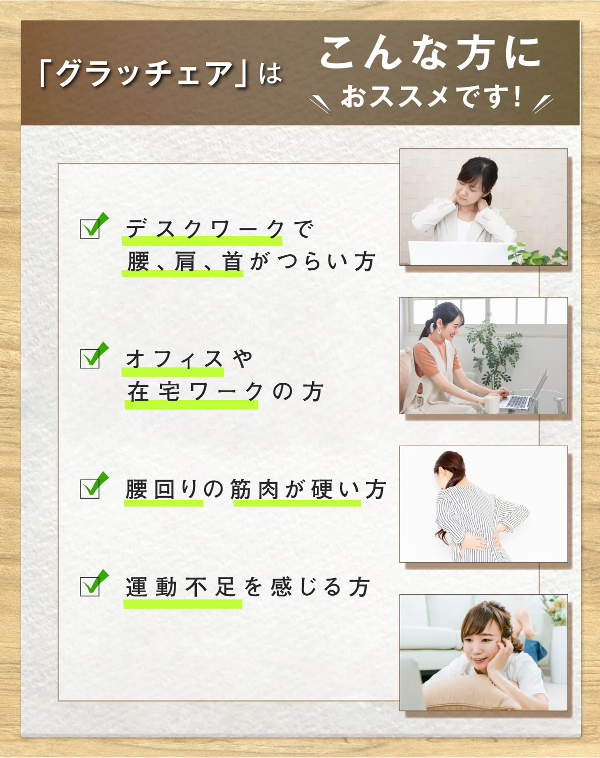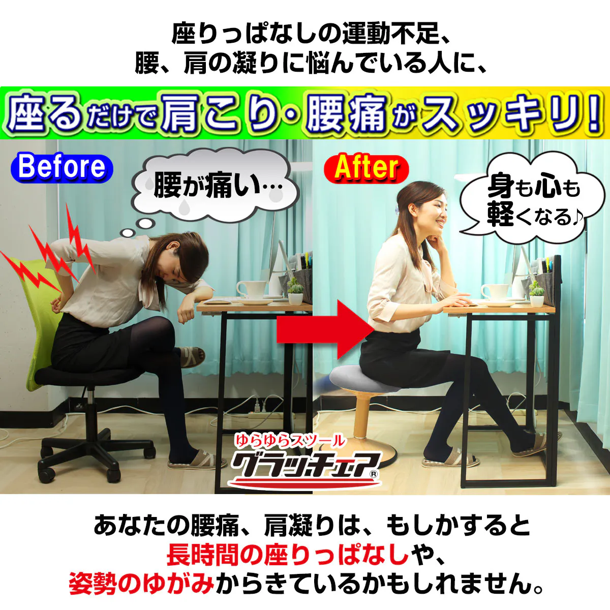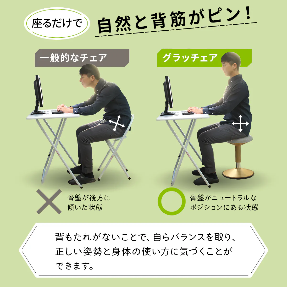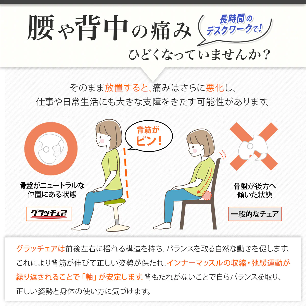 「グラッチェア」なら普段のオフィスワークでフィットネスジムに通っているように体幹筋が鍛えられ、腰や肩のつらさに負けない体が作れます。