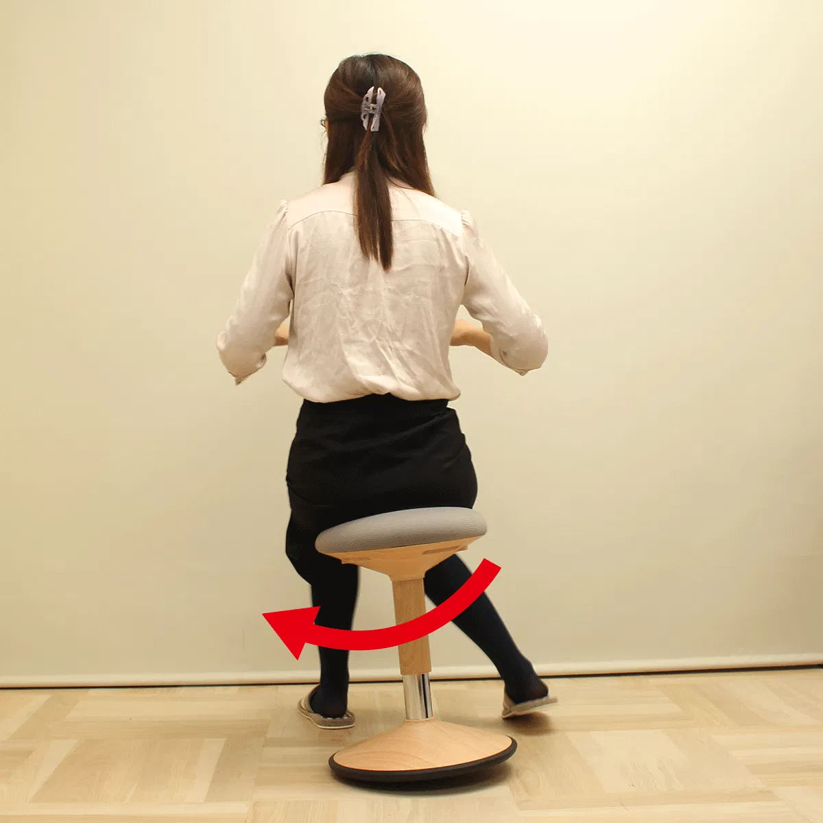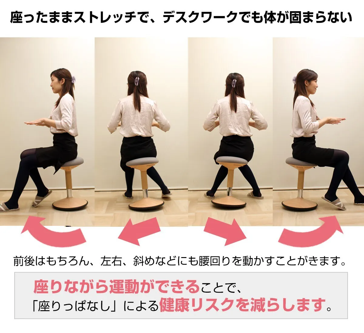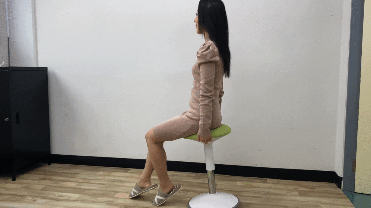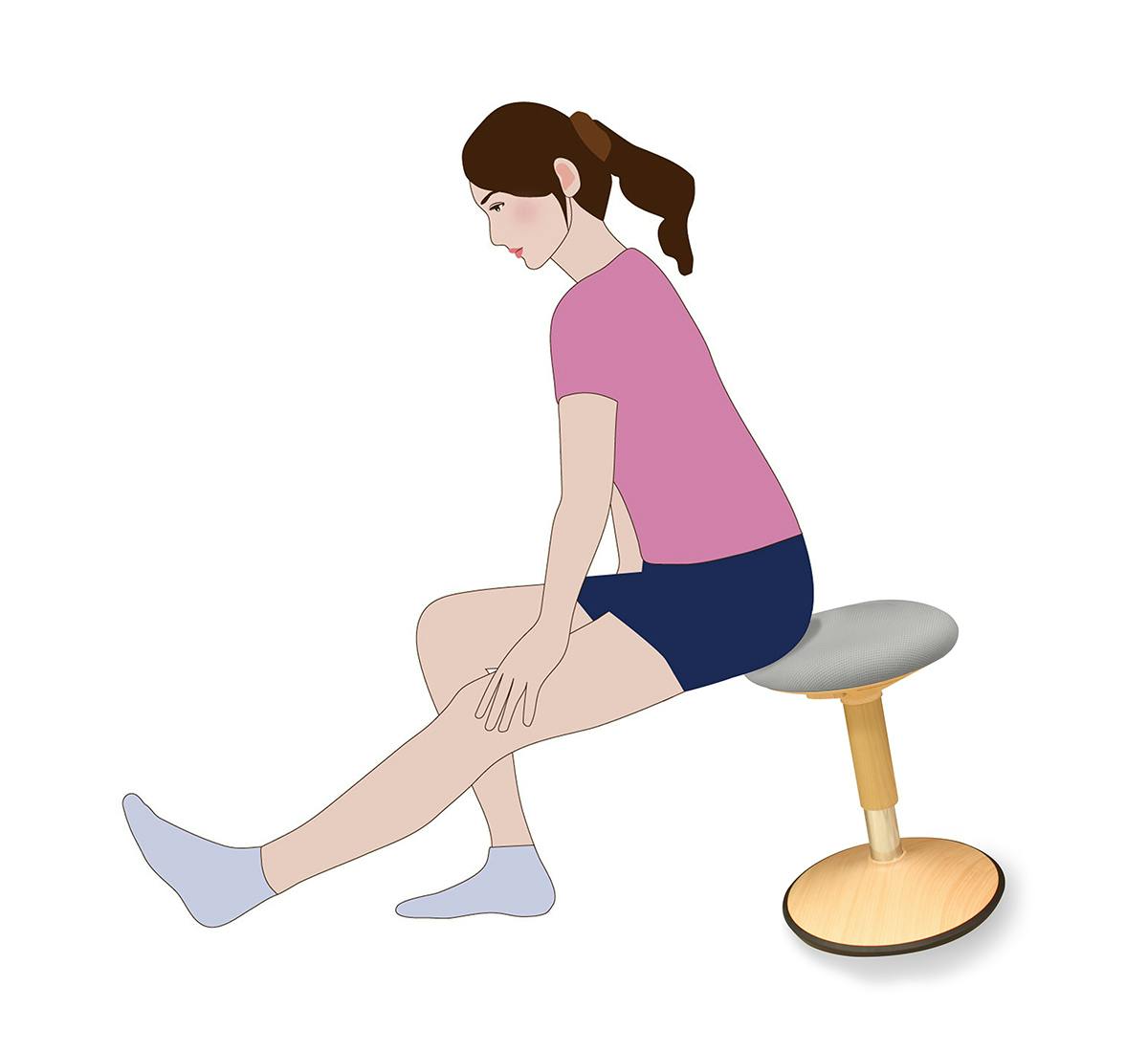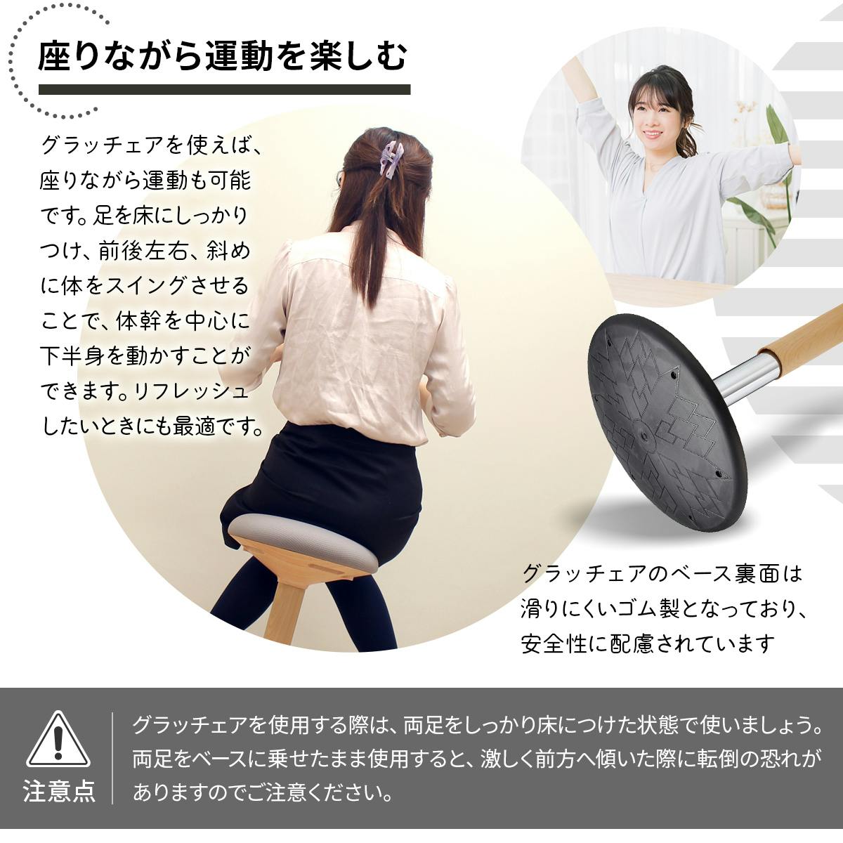 「おきあがりこぼし構造」の「グラッチェア」は座りながら腰を回したり、腹斜筋を伸ばしたりといったストレッチが簡単。