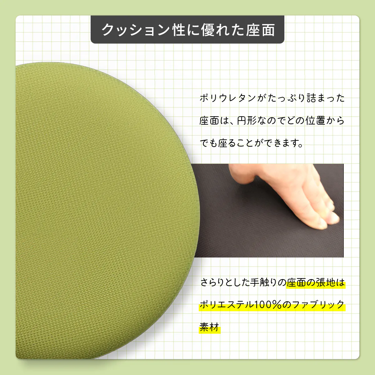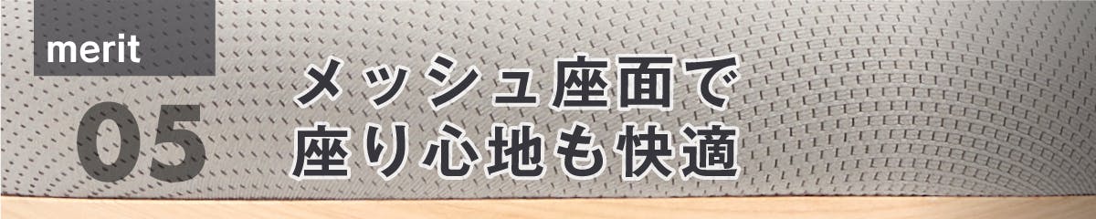 「グラッチェア」のシートは心地よい弾力があるクッションを採用し、お尻に掛かる重圧を効率的に分散。さらにメッシュ生地を採用しているので通気性が良く、お尻の蒸れを軽減。抜群の座り心地を約束します。